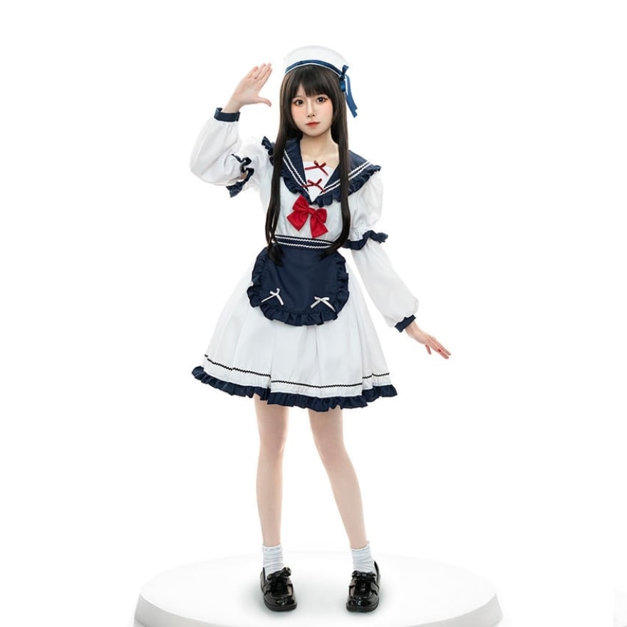 クラシカルなセーラー服とメイド服が融合した、上品なコスチュームです。リボンと帽子が、愛らしい雰囲気を演出し、イベントやパーティーで注目を集めます。