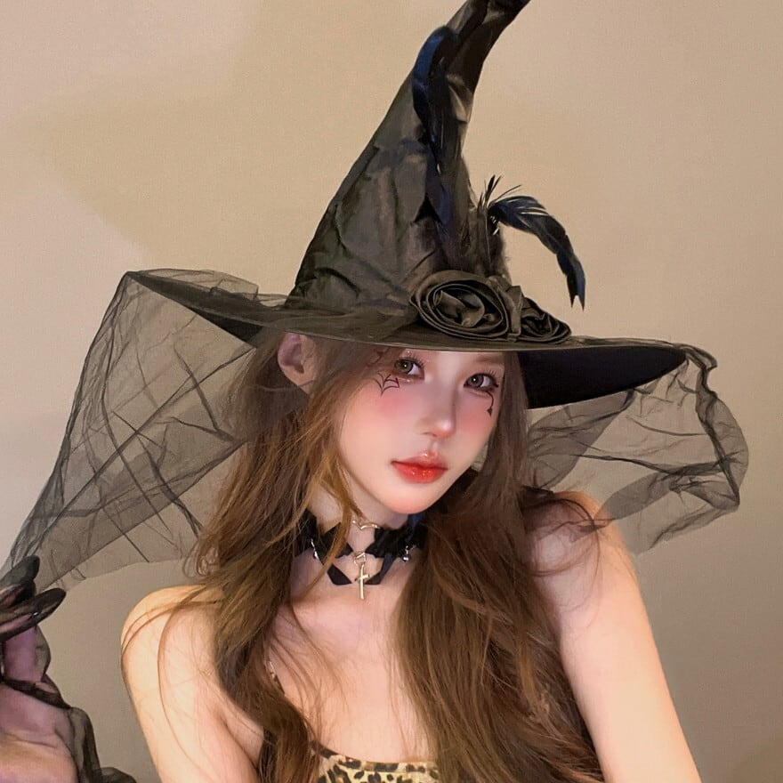 ハロウィンの夜を彩る、シックな魔女の装い。漆黒のワンピースと魔女の三角帽子が、あなたの存在をミステリアスに引き立てる。