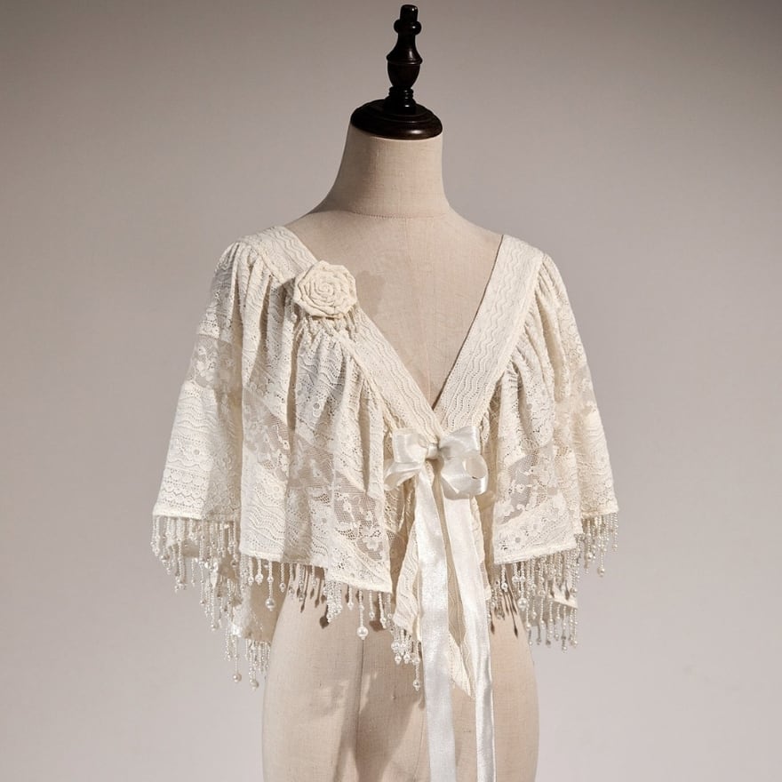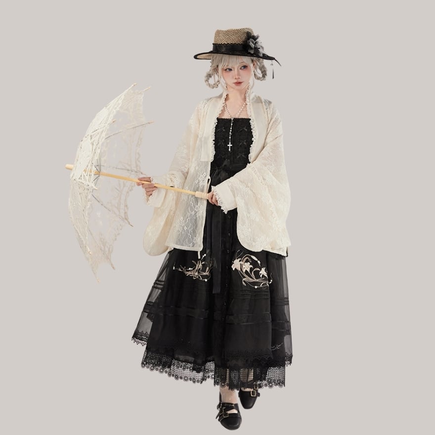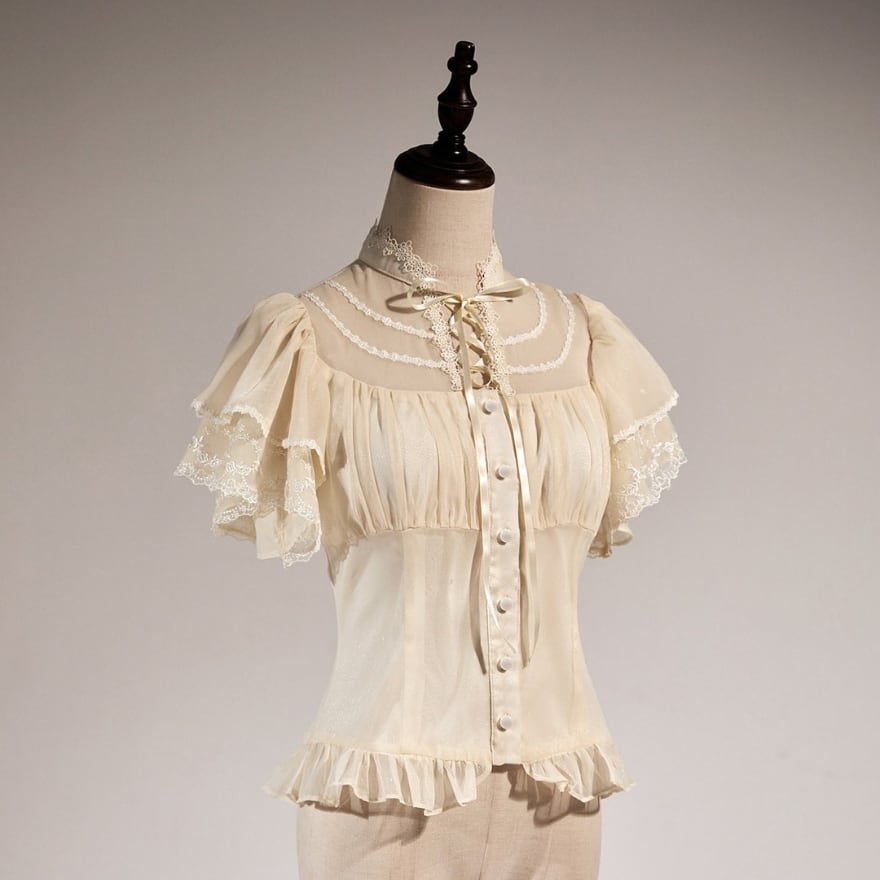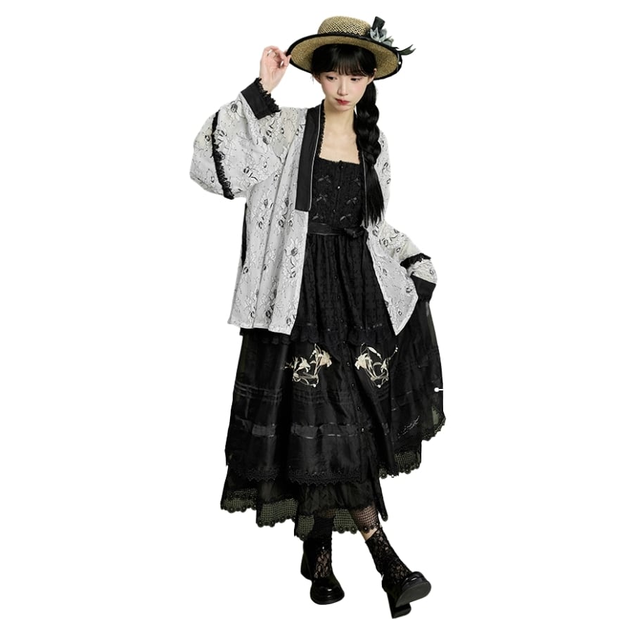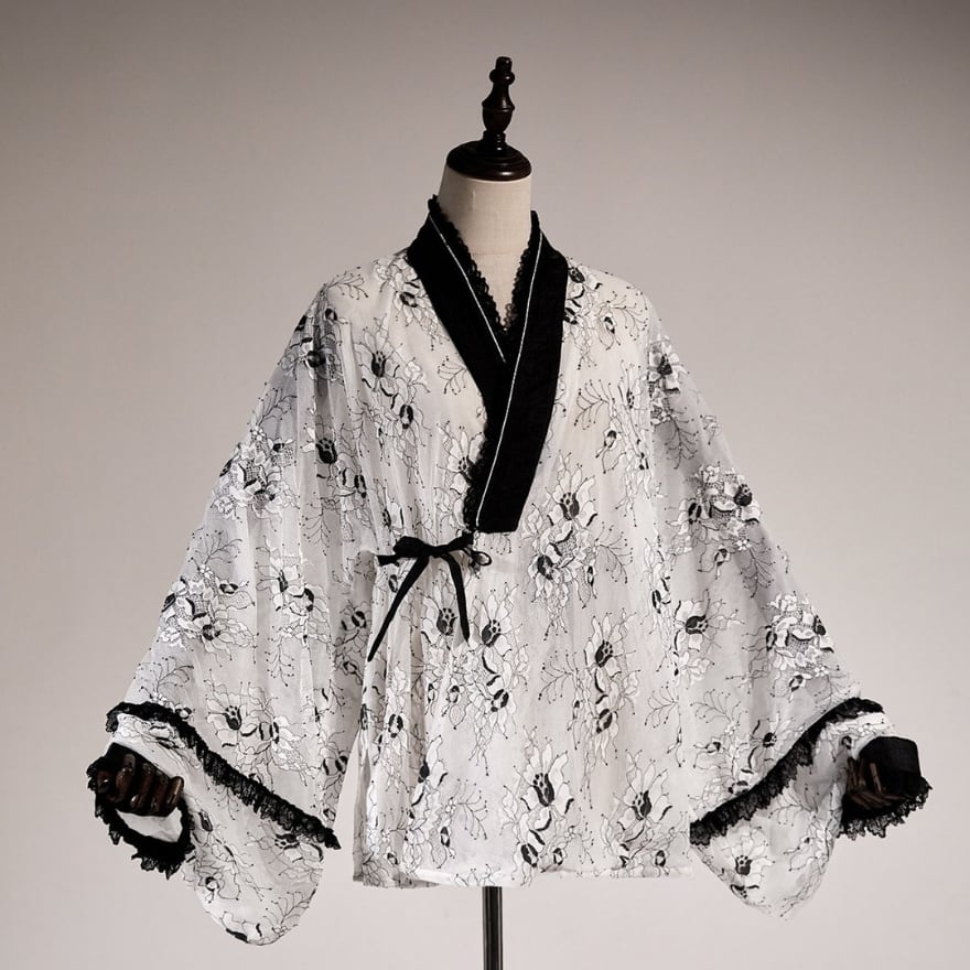 東洋の華やかさと、西洋の可憐さが溶け合う、幻想的なトップス。着物風のデザインと繊細なレースが、あなたのスタイルを雅に彩る。
