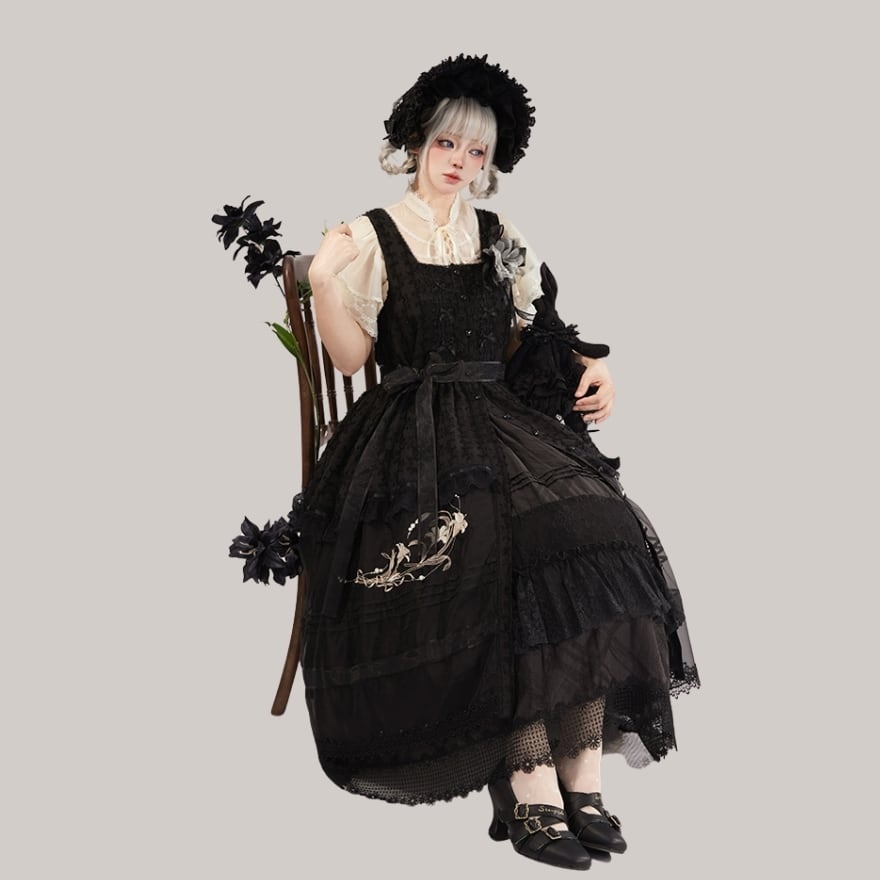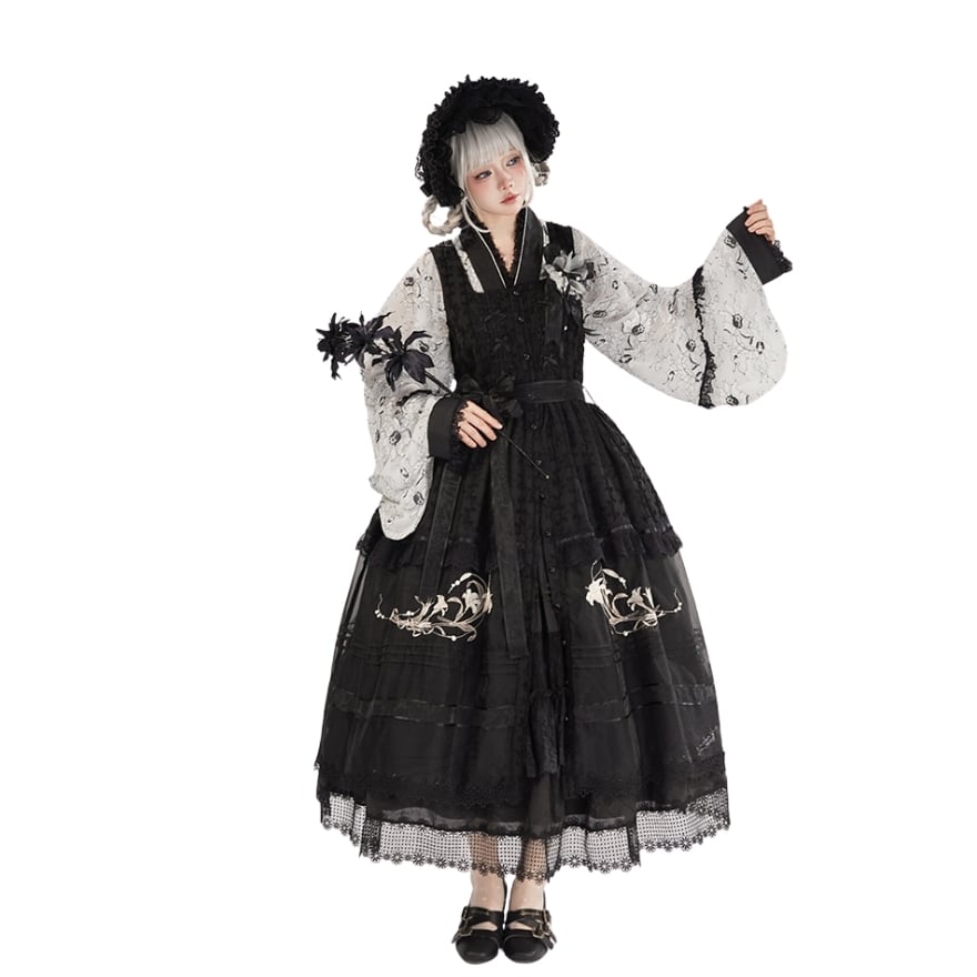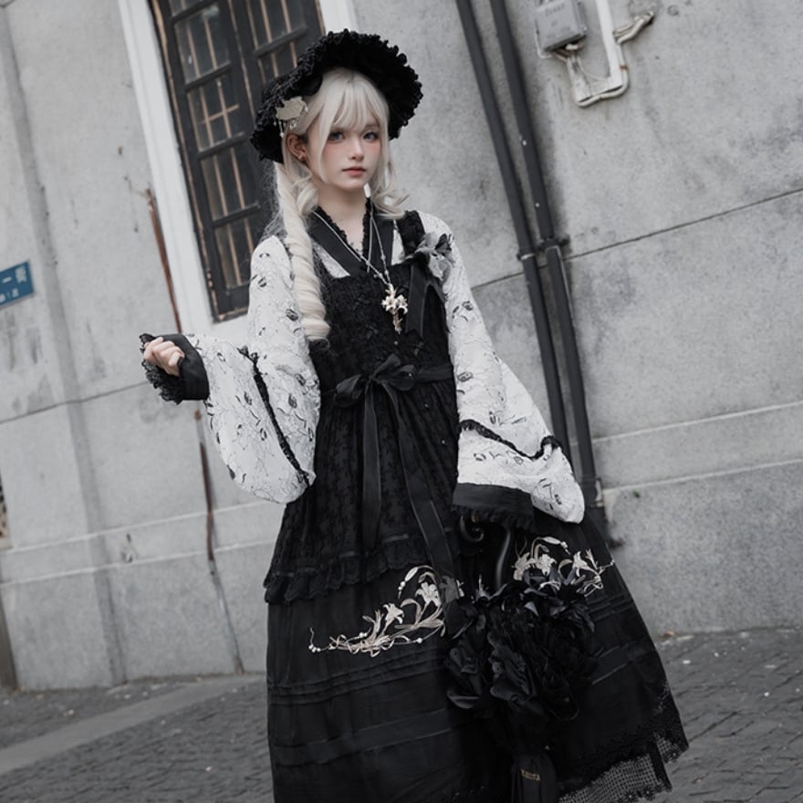 着物のように前で合わせるデザインが、東洋の美しさを演出。そこに、クラシカルなロリィタのフリルやレースが加わり、異文化が融合したような独特の世界観を生み出しています。