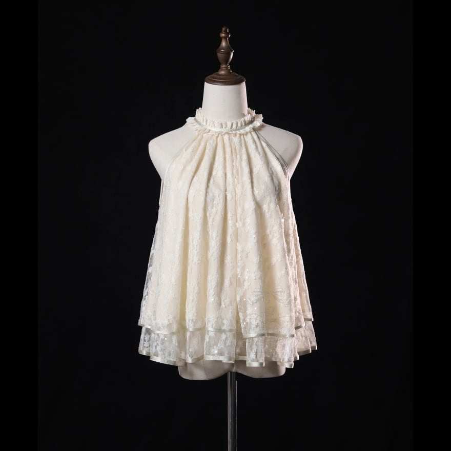 インナー: 繊細なレースとフリルが美しいホルターネックブラウス。