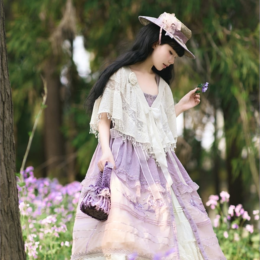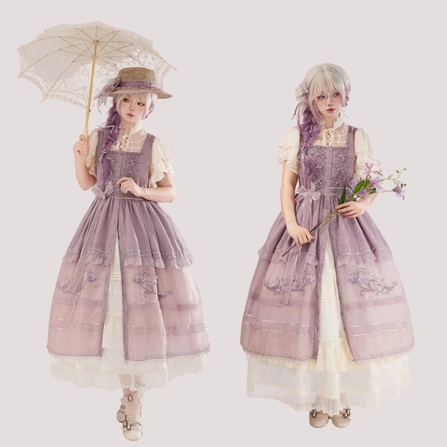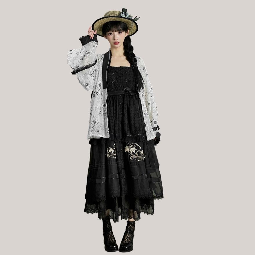 東洋の華やかさと、西洋の可憐さが溶け合う、幻想的なジャンパースカート。着物風のデザインと繊細な花柄が、あなたのスタイルを雅に彩る。