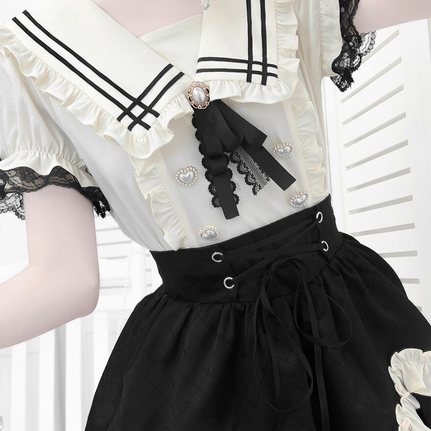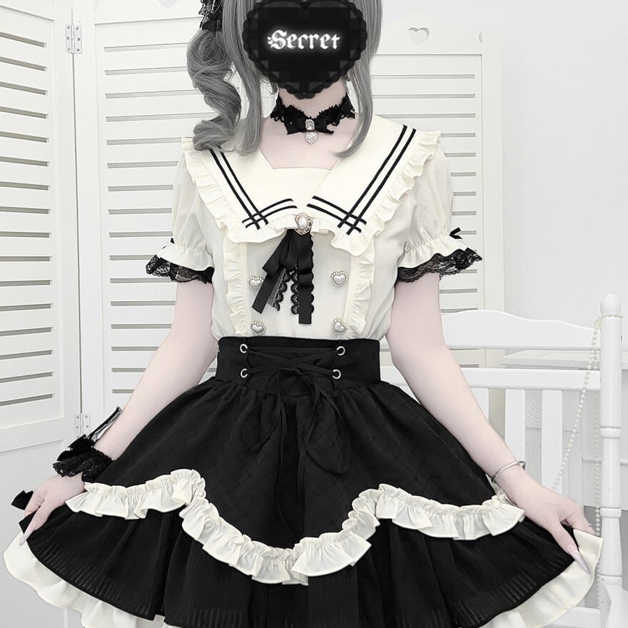 アイボリーのセーラー風トップスと、ブラックのレースアップスカートのセットアップです。