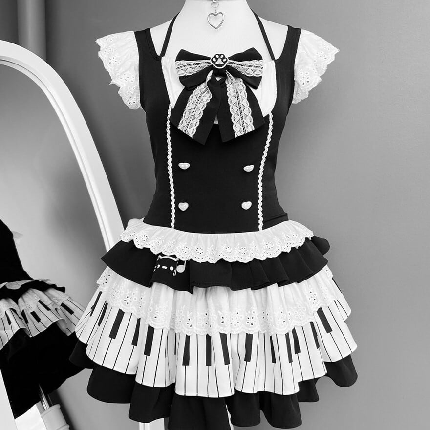 ブラックのビスチェ風トップスと、ピアノの鍵盤柄が目を引くティアードスカート、そして同柄のアームカバーがセットになった個性的なアイテムです。
