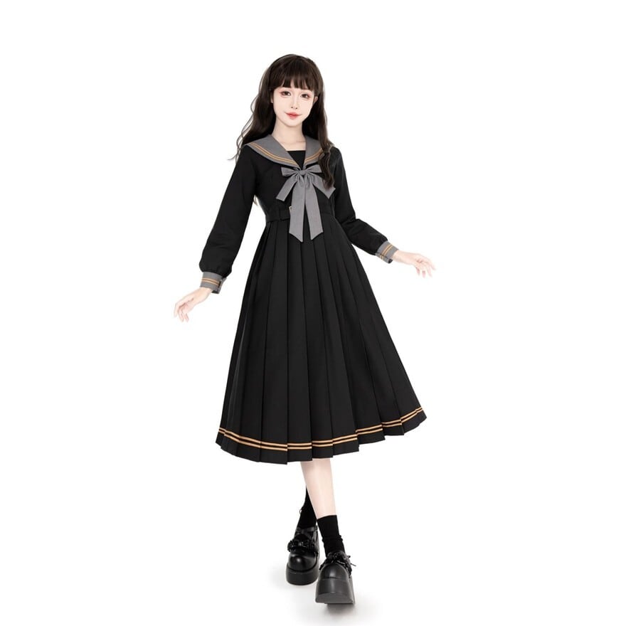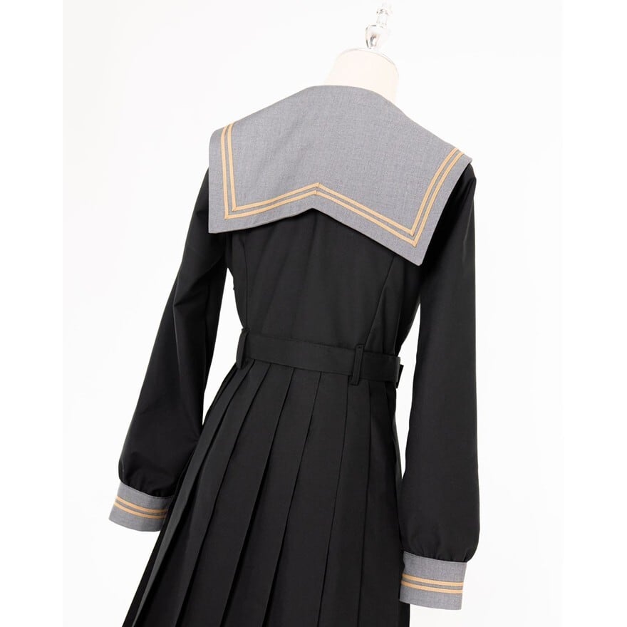 黒い生地に、グレーのセーラー襟とボウタイ、袖と裾には黄色のラインがデザインされた、モダンなセーラー服風ワンピースです。
