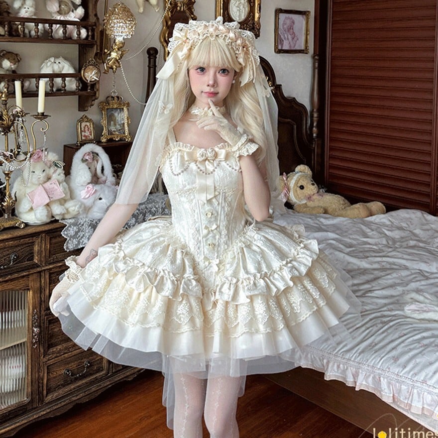 こちらはコルセット風の胸元と、幾重にも重なったフリルスカートが特徴的なロリータドレスです。