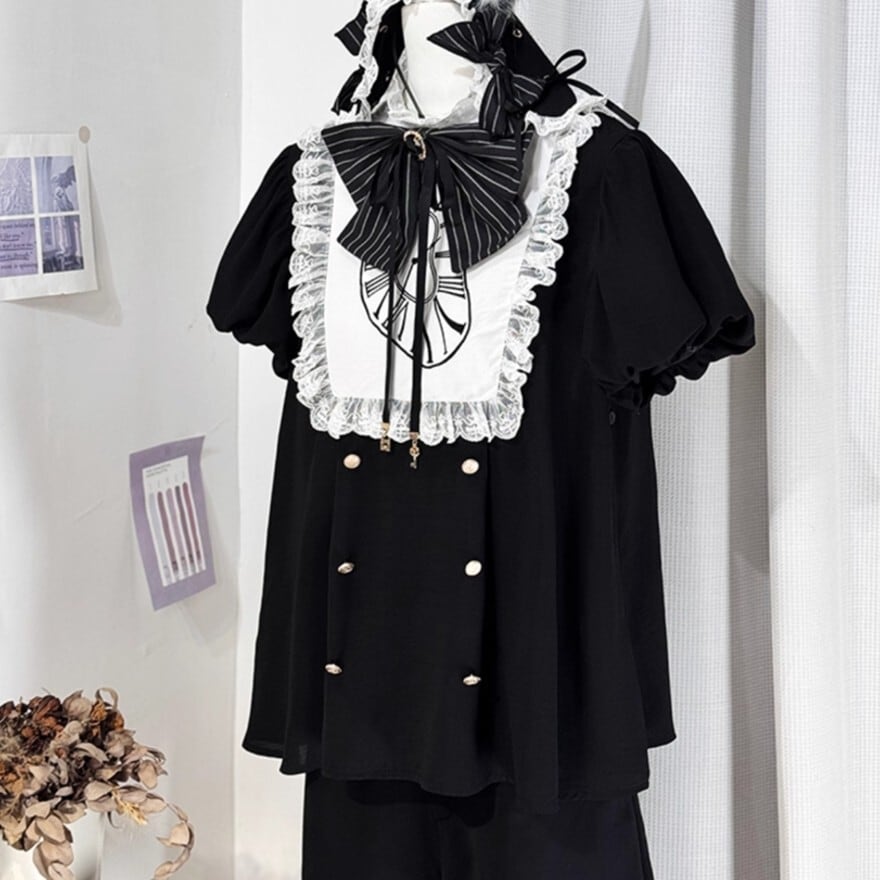 パフスリーブの上着と、ふんわりとしたシルエットのズボンが、上品でドーリーな印象を与えます。カチューシャと付け袖、蝶結びもセットになっており、コーディネートをさらに華やかに彩ります。
