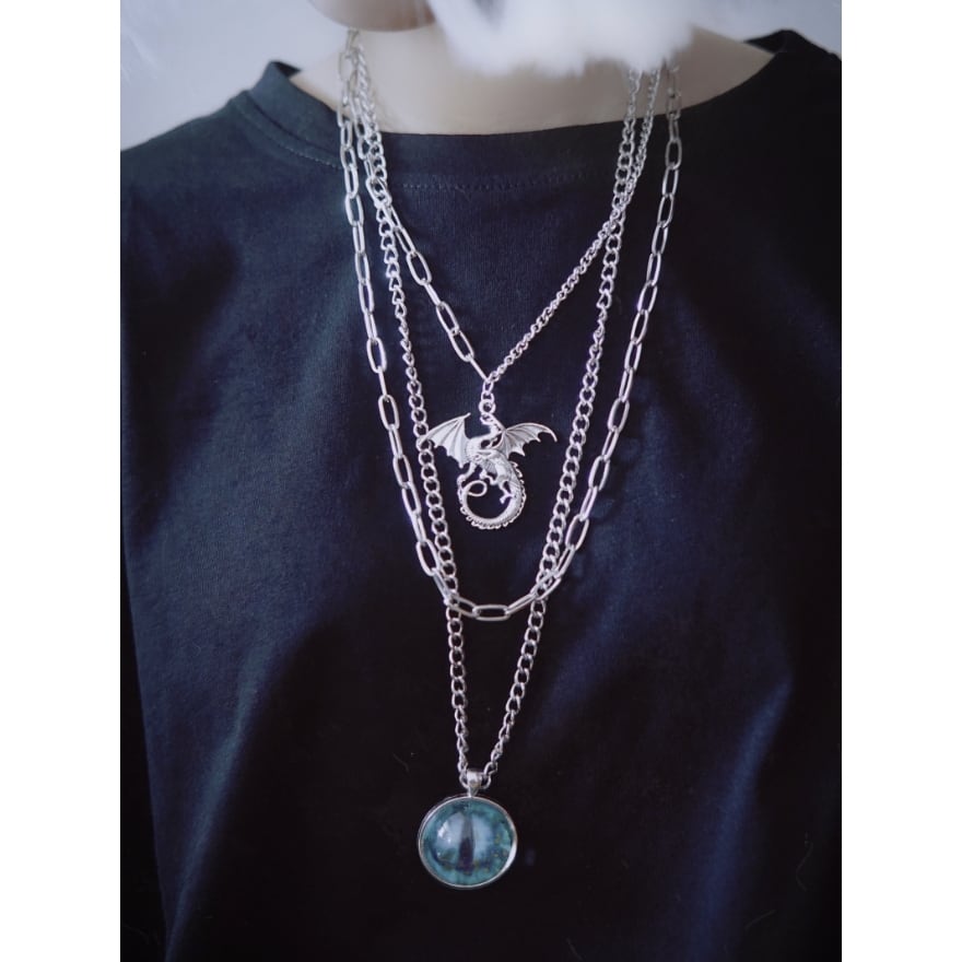 異なる太さと長さのチェーンが3連に重なり、胸元に立体的な存在感を演出します。中央には、今にも動き出しそうな精巧なドラゴン、そしてその下には、まるで魔法が閉じ込められたかのようなミステリアスな輝きを放つオーブチャーム。身につけるだけで、ダークファンタジーの世界観を纏い、周囲を惹きつける圧倒的なオーラを放つ、サブカル系ファッションの決定版アイテムです。