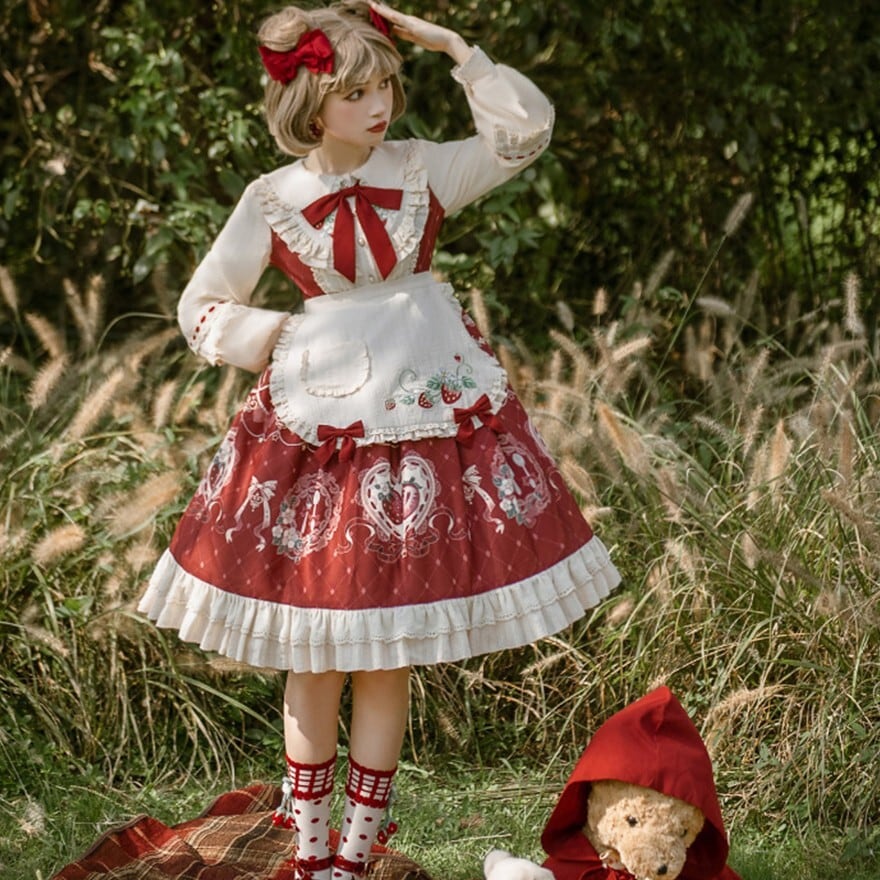 甘くてドーリーな雰囲気を存分に楽しめるセットアップ。ワンピースだけでも着用できますが、ケープを羽織ることで、まるでおとぎ話の主人公のような装いが完成します。いちご狩りや、可愛らしいカフェでのランチ、友人とのアフタヌーンティーなど、特別な日のお出かけにぴったりです。白いヘッドドレスや、イチゴモチーフのアクセサリーなどを合わせると、より一層可愛らしさが引き立ちます。