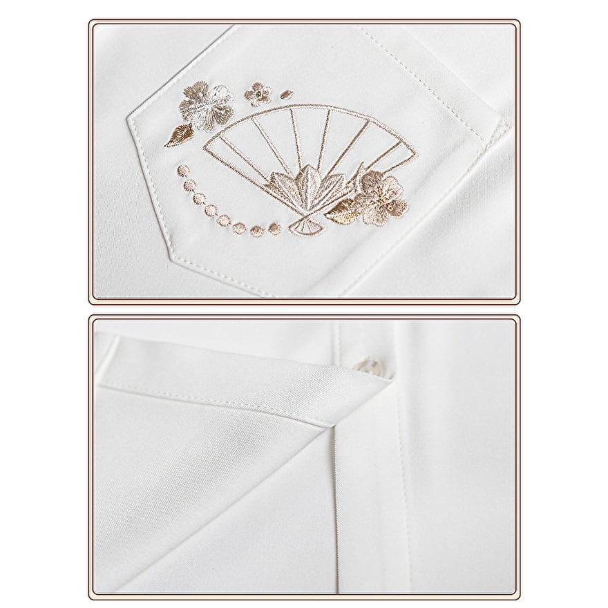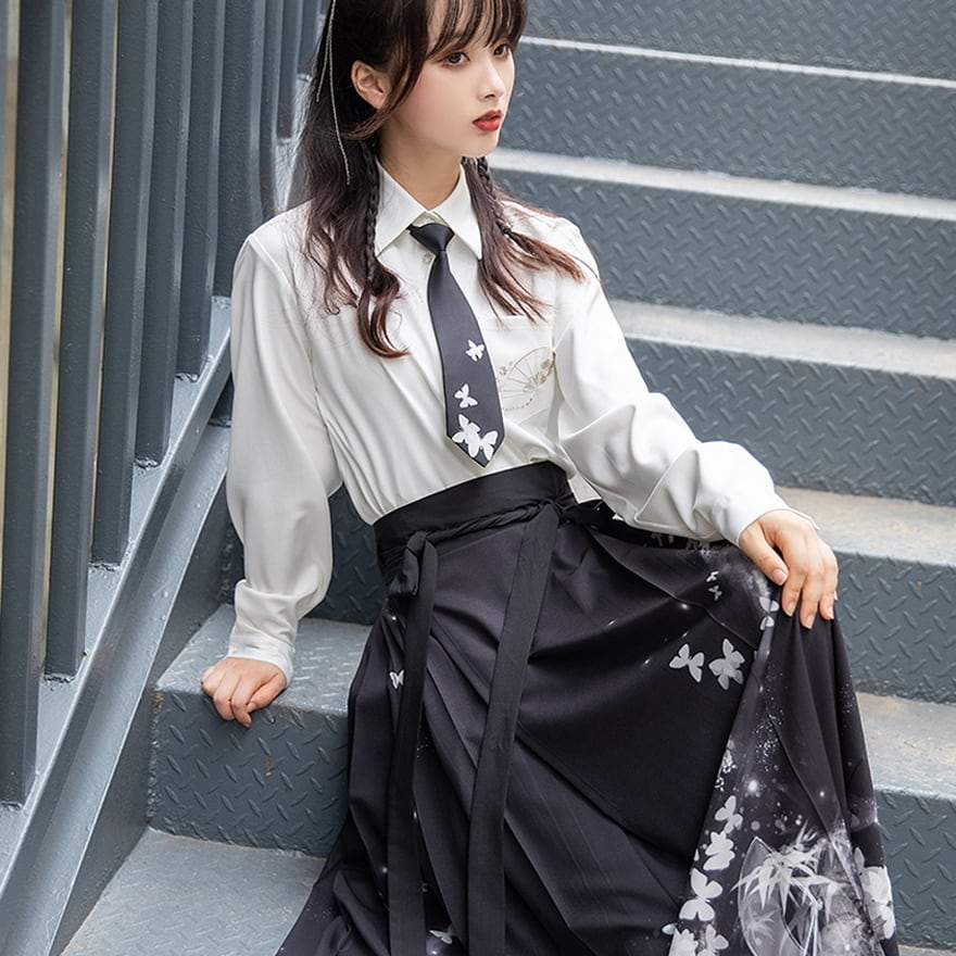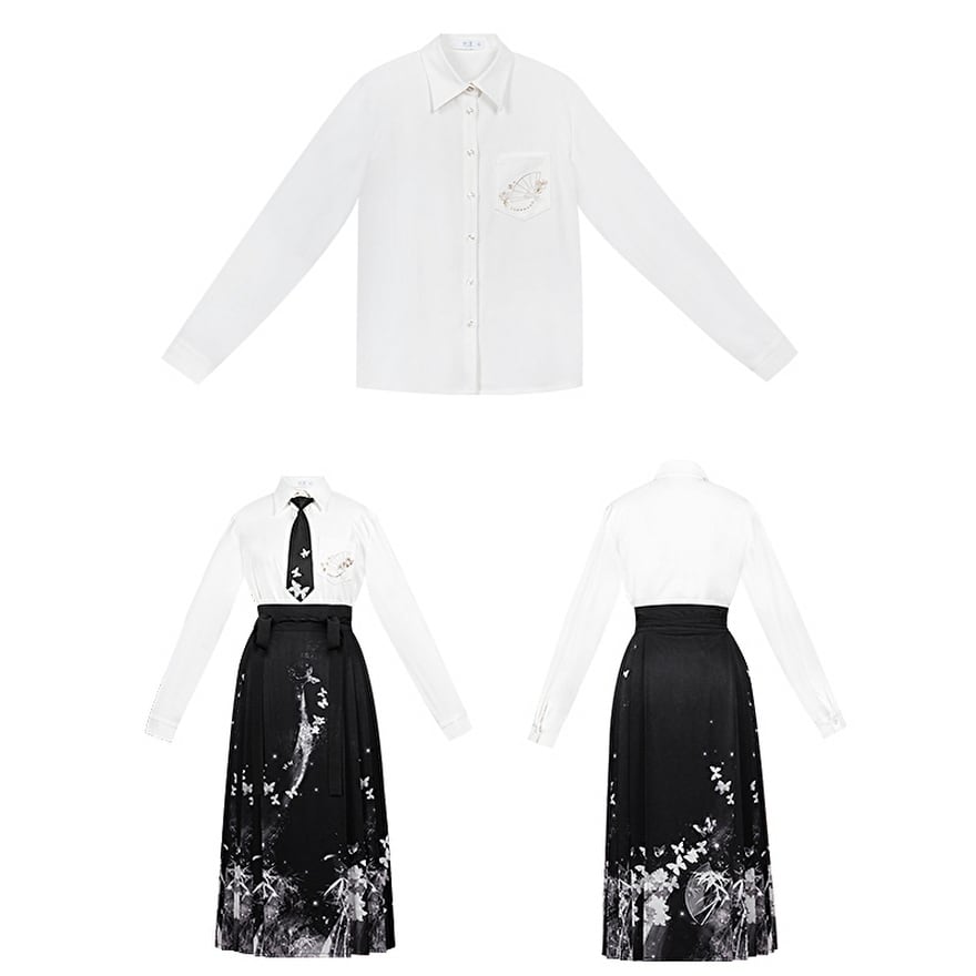 butterfly刺繍が病み可愛いレトロなチャイナ服 ネクタイ、シャツ、ラップスカートの上下セット