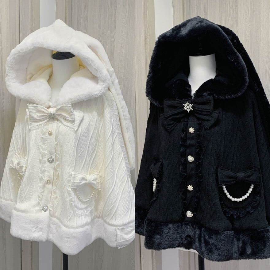 フードにあしらわれた長いうさ耳と、袖口や裾、フード周りにたっぷり使用されたふわふわのファーが特徴のケープコートです。