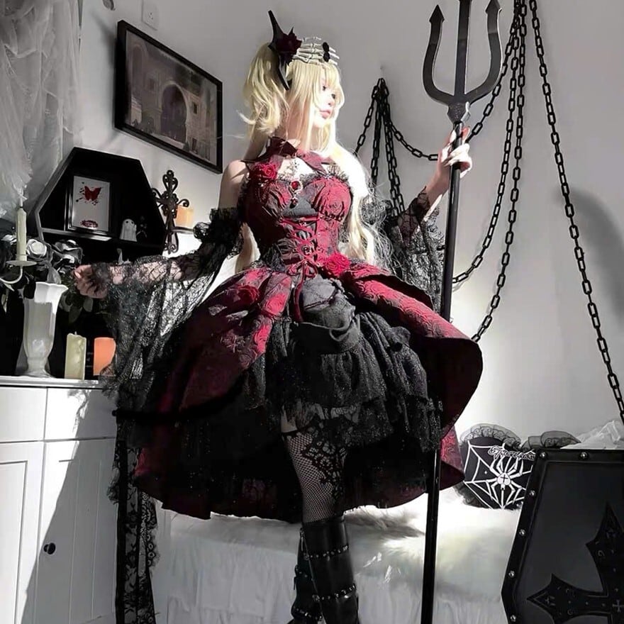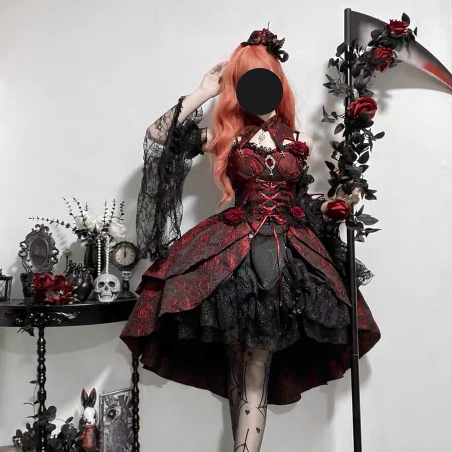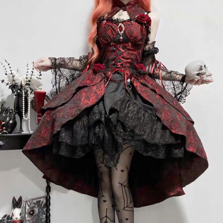 赤と黒の劇的なコントラストが目を引く、ゴシックロリータスタイルのドレスセットです。