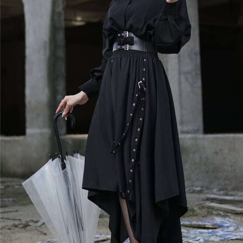 ゆったりしたサイズ感の黒シャツにウエストベルト付きの長袖シャツとスカートのセットアップ