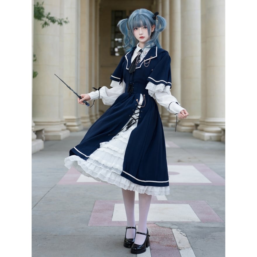 ネイビー(濃紺)を基調とし、ホワイトのパイピングとレースフリルがアクセントになった、ケープ、ベスト、ブラウス、スカートの四点からなるセットアップです。