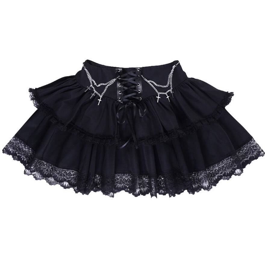 ウエスト編み上げにレースレイヤードのハードゴシックミニスカートです。