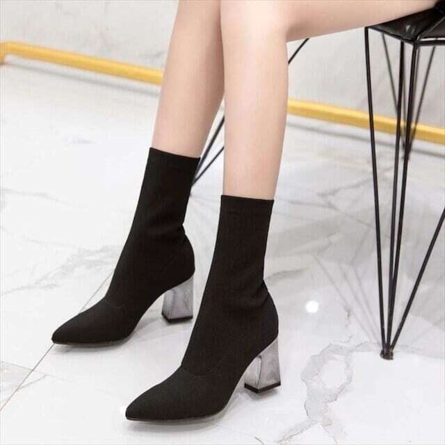 視線を奪う輝き。クリアブロックヒールの美脚フィットソックスブーツ