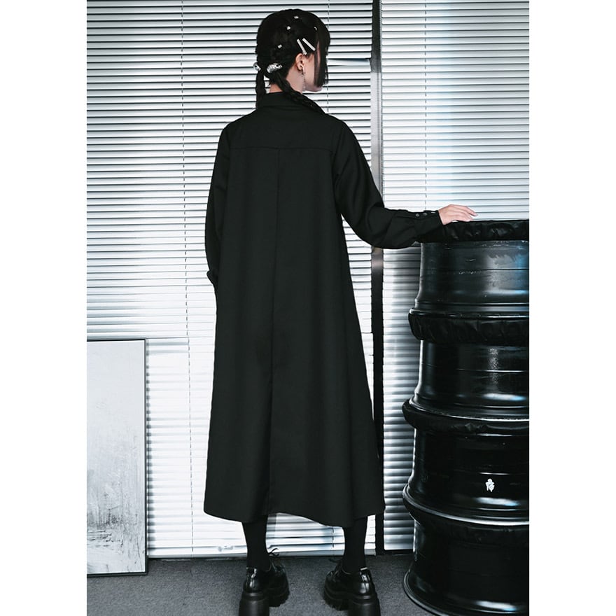 シックなブラックを基調とした、モードな雰囲気漂うロング丈のシャツワンピースです。