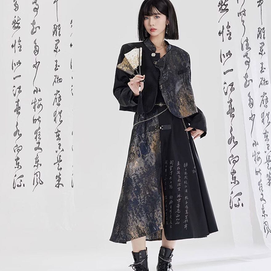 漆黒の生地に流麗な書がプリントされ、古びた金属や壁画を彷彿とさせるアーティスティックな生地を大胆に組み合わせた、アシンメトリーデザインのロングスカートです。