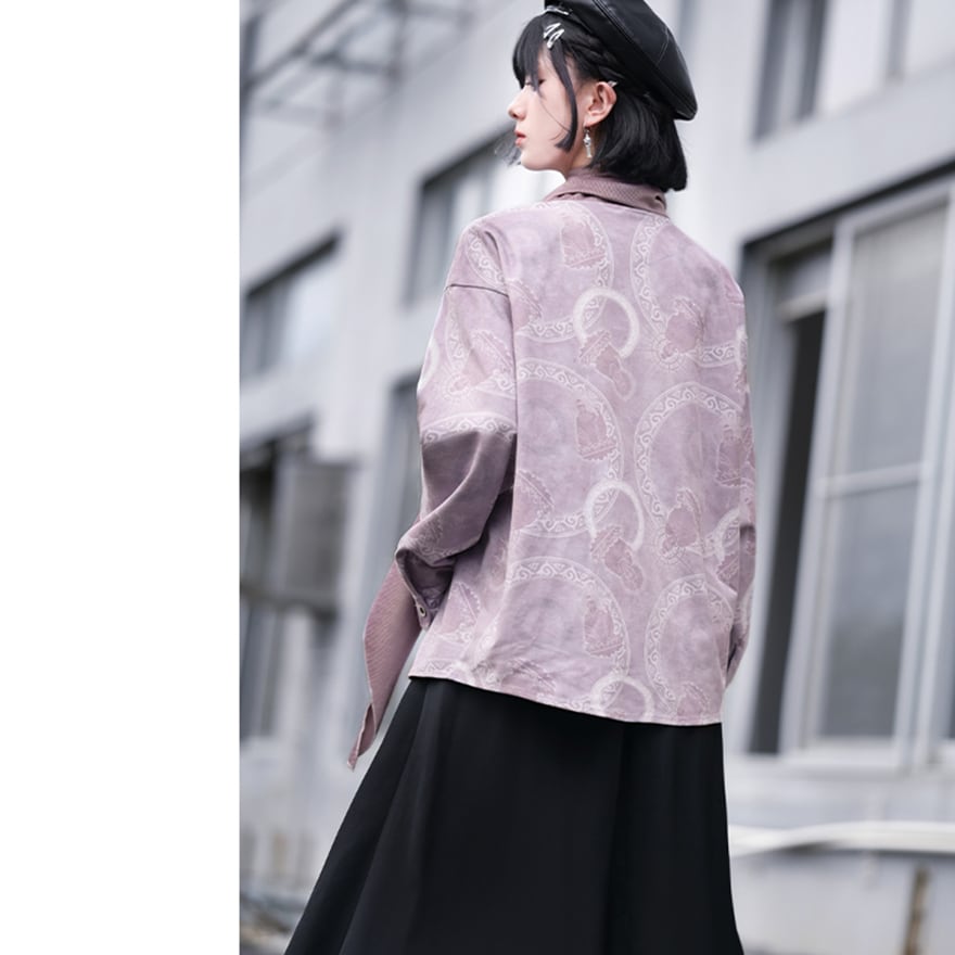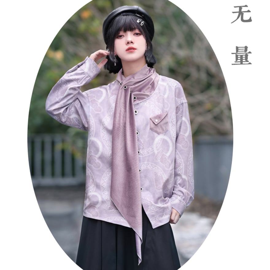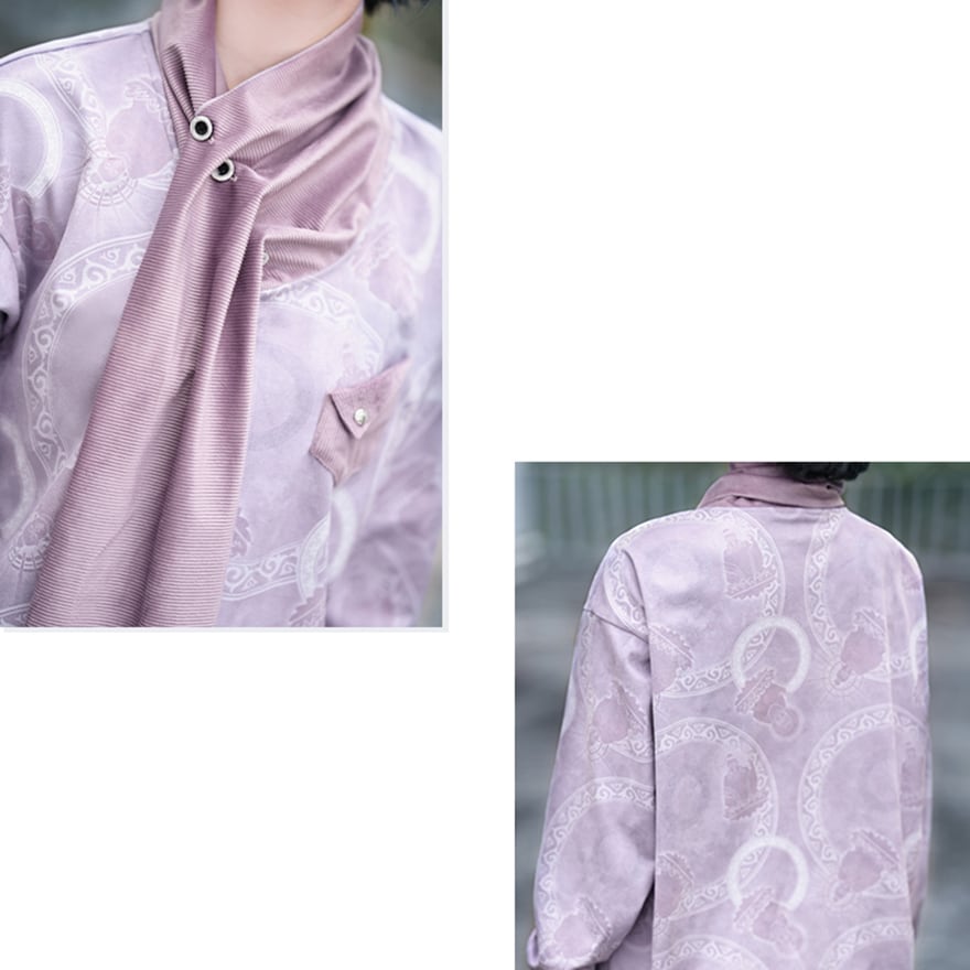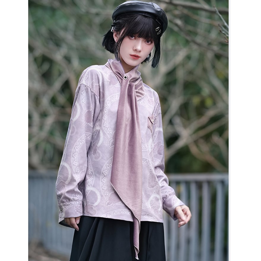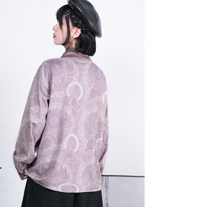 くすんだラベンダーカラーの生地に、ミステリアスな雰囲気の紋様が広がる、チャイナ風のデザインシャツです。