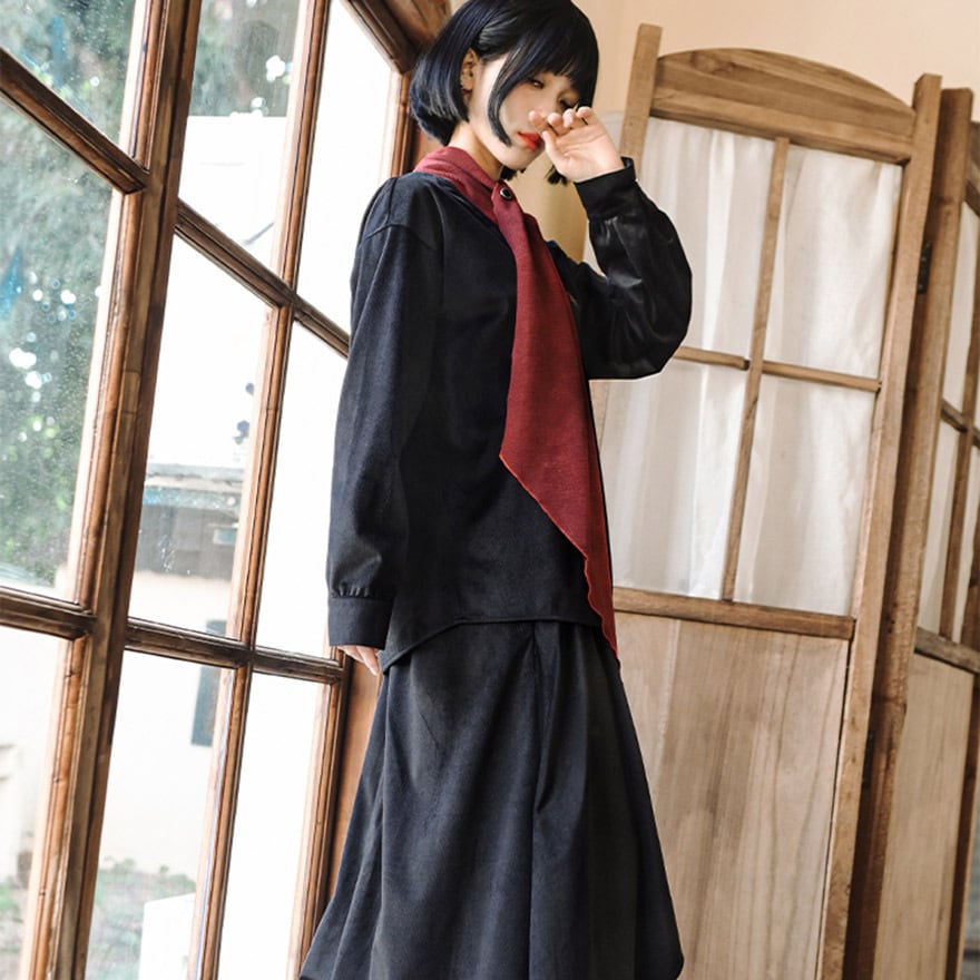 漆黒のコーデュロイ生地に、目を引く深紅のスカーフが一体化したデザイン性の高いドレスシャツです。