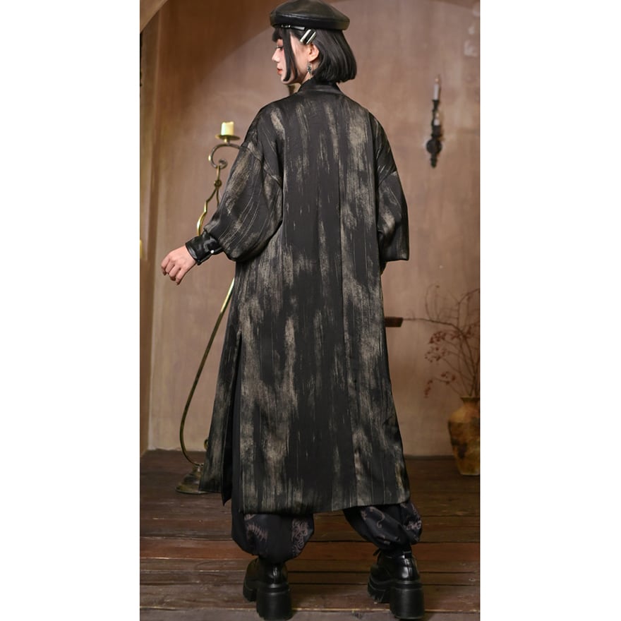 まるで一枚の絵画のように、掠れたブラッシュペイント風のプリントが全面に施されたアーティスティックなロングコートです。
