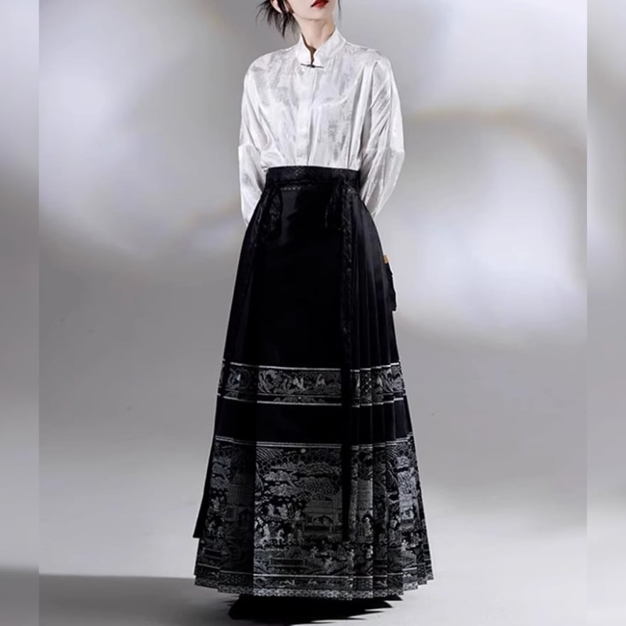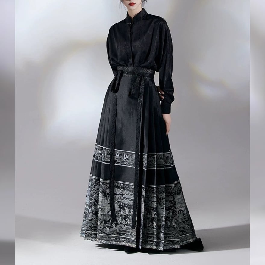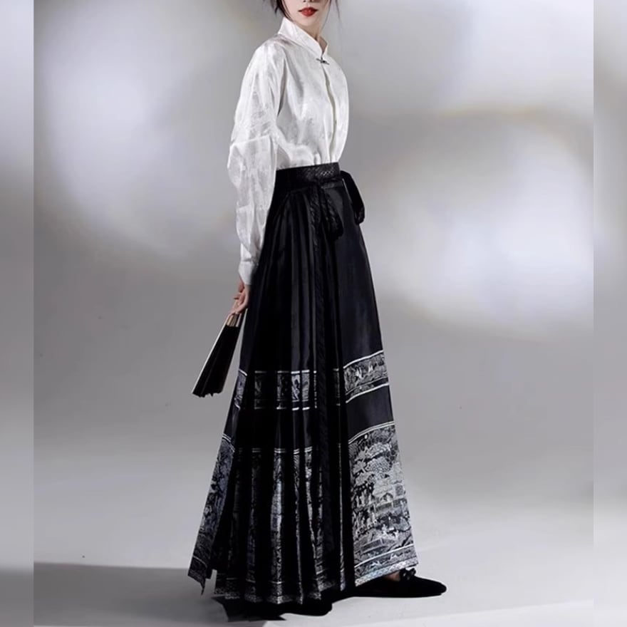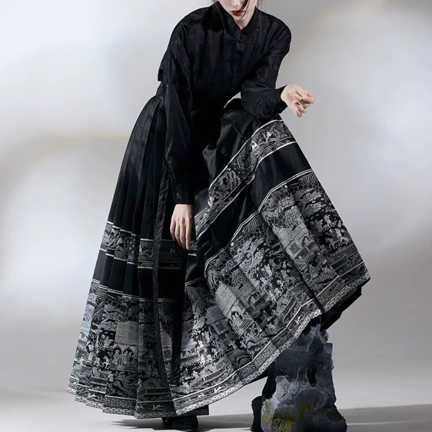 ハイウエストロング丈のチャイナ風プリーツスカートです。