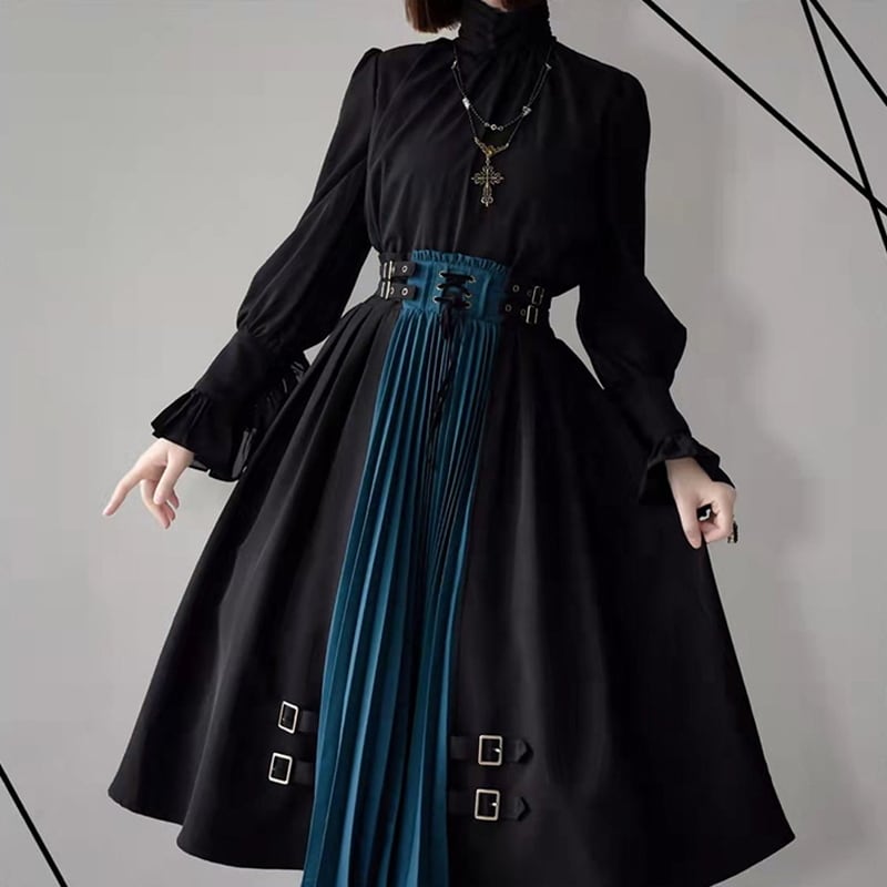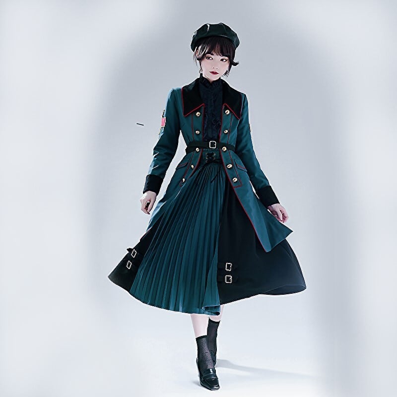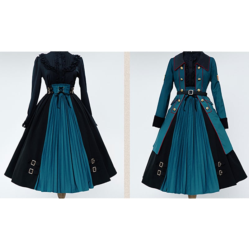 即納 Mサイズ ミリロリ 軍服ロリィタ 編み上げウエスト プリーツスカート シアン