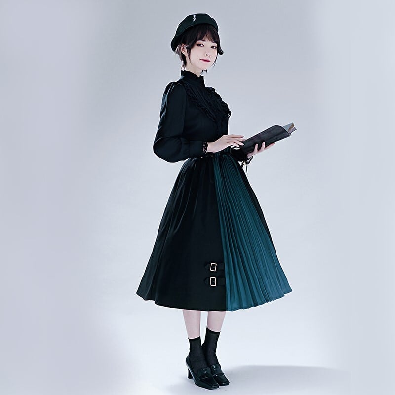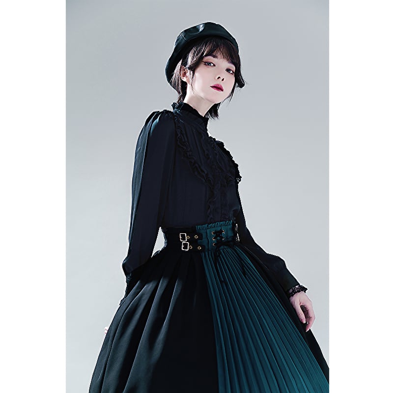 ウエストマーク代わりのウエスト編み上げにロング丈のプリーツスカートになります。