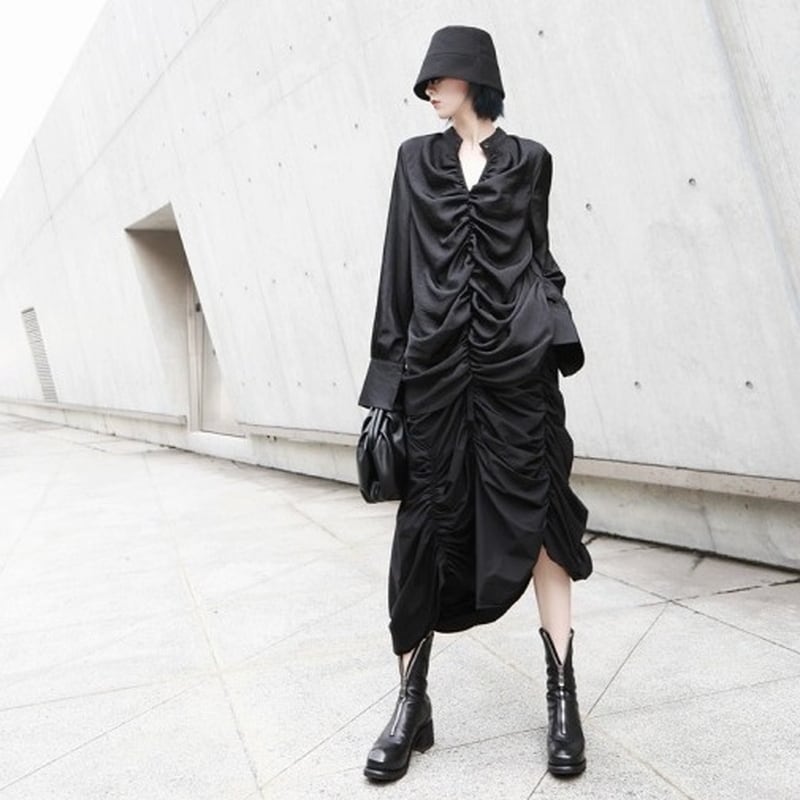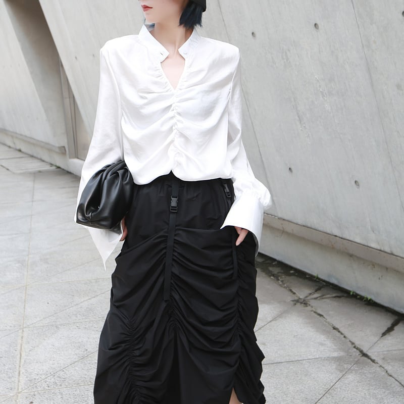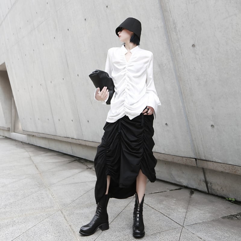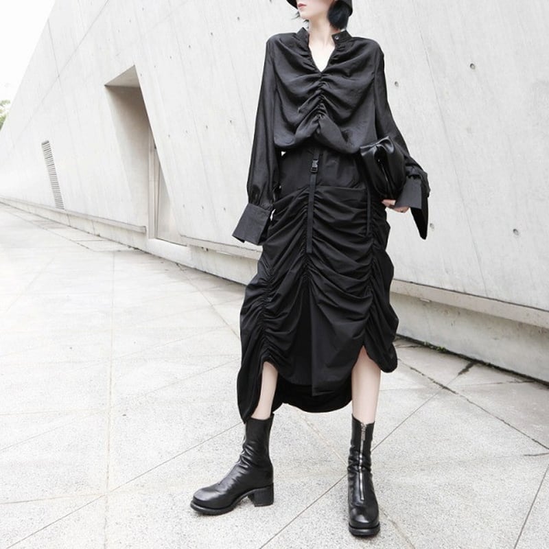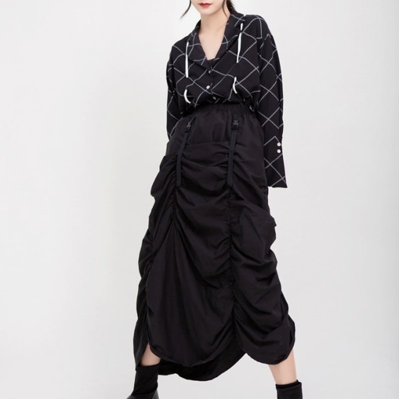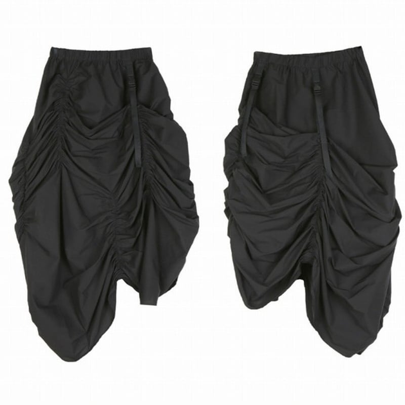 即納 ブラック フリーサイズ モード系 モノトーン スカート ギャザー シャーリング