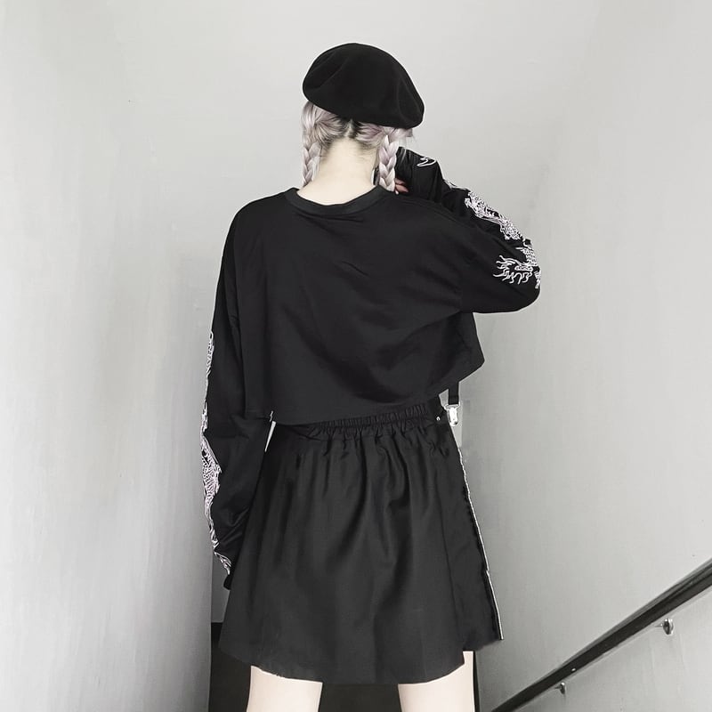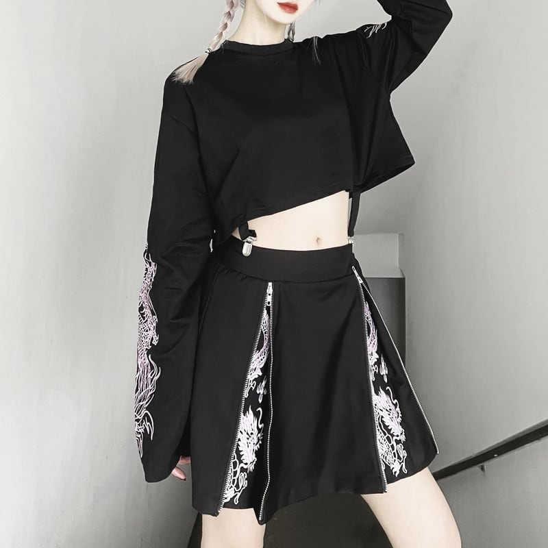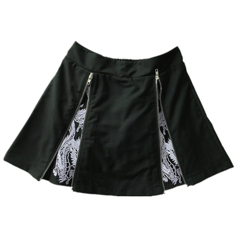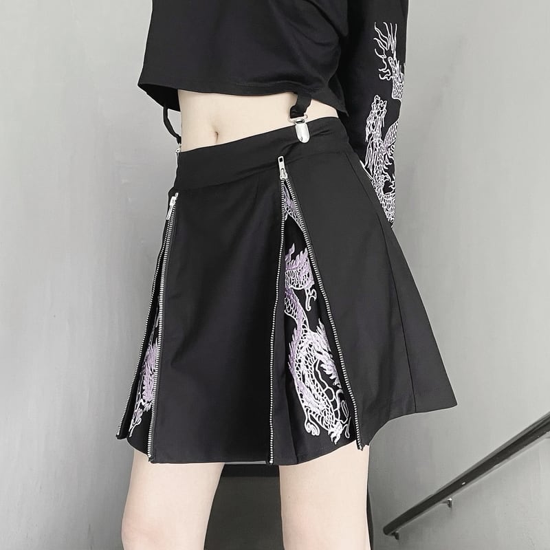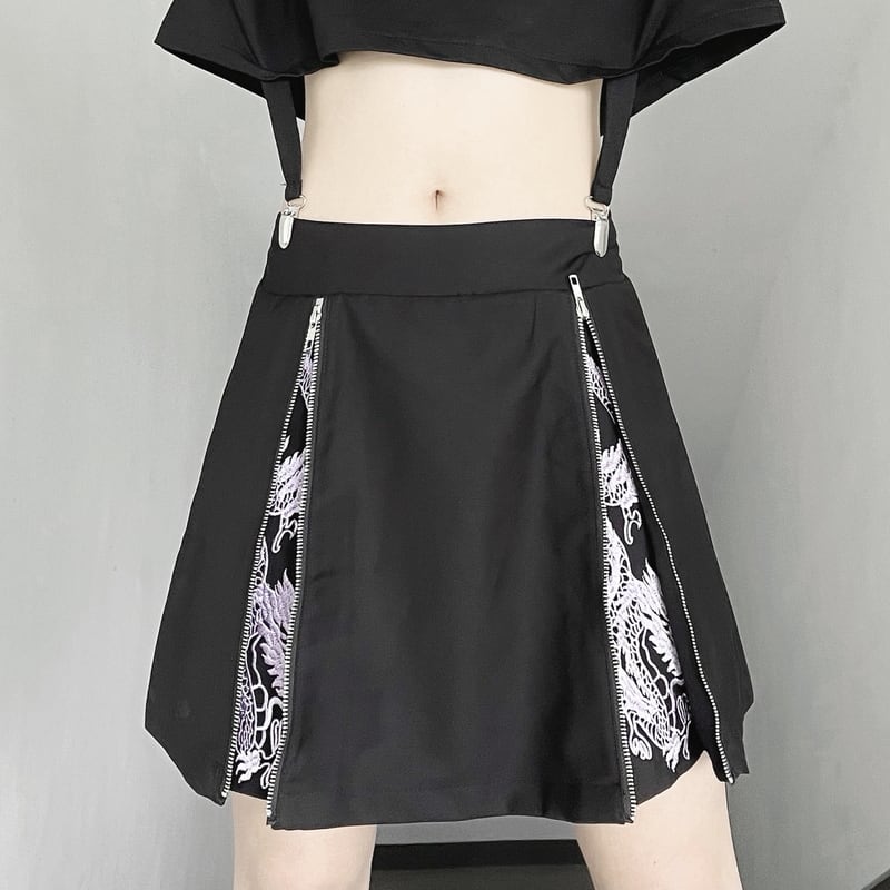 ダブルZIPを広げると病み可愛いドラゴン刺繍が広がるビジュアル抜群なミニスカです。