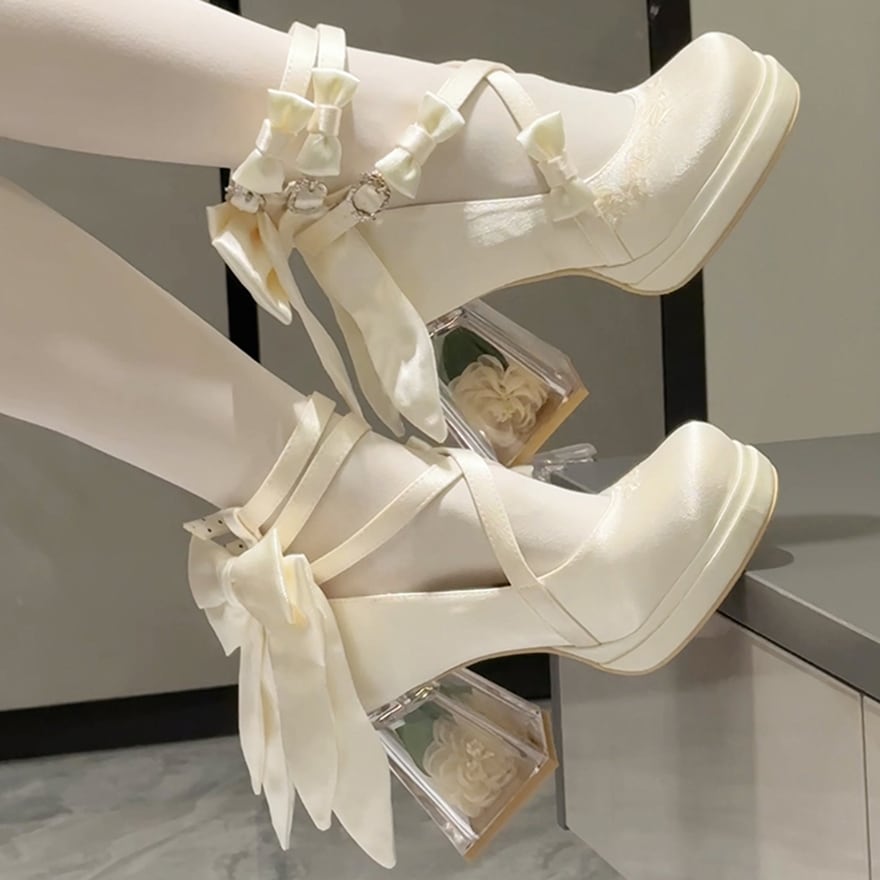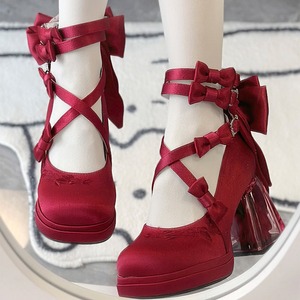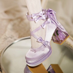 厚底パンプス ハイヒール ロリィタ リボン ストラップ サテン クリアヒール 量産型メリージェーンシューズ