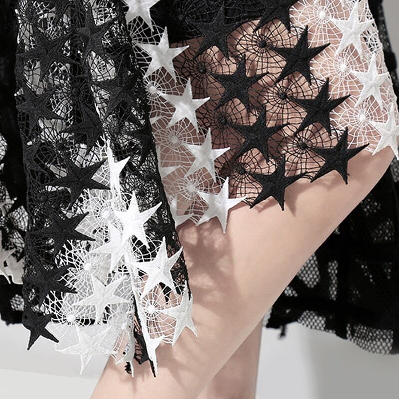 アシンメトリーなスカート丈に星柄がおしゃれなデザイン。ウエストビシューがさり気なくハイウエストを主張して可愛さキープの大人増しシルエットが叶います。