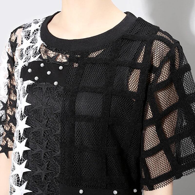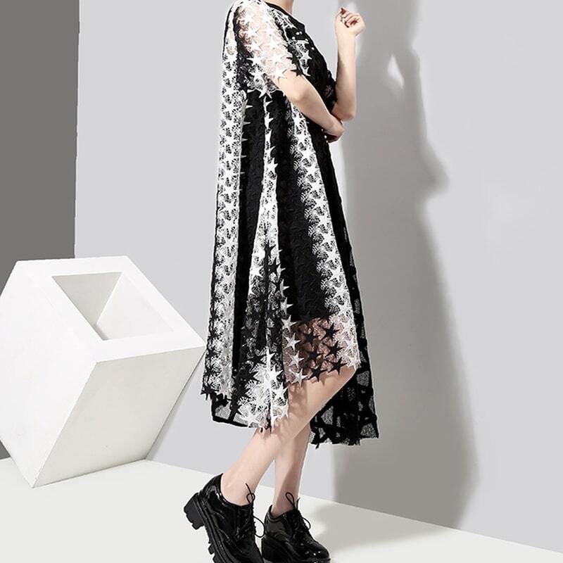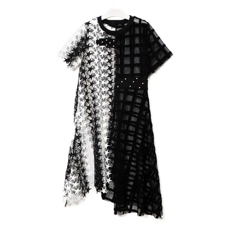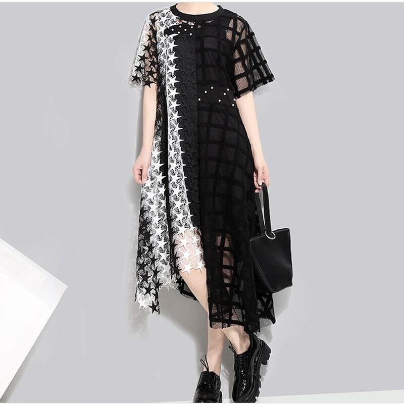 モード系 ワンピ 半袖 ミモレ丈 大人ゴシック バイカラー メッシュ 透け感