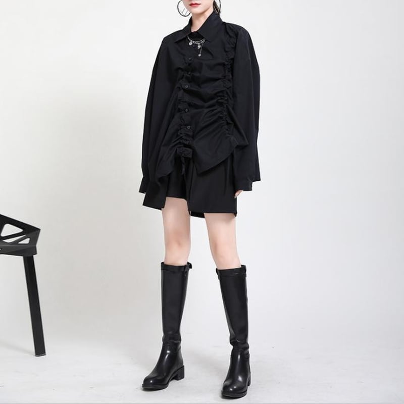 前身頃の紐を調整すれば可愛い巾着ギャザーでアシメシャツに切り替わるトップスです。