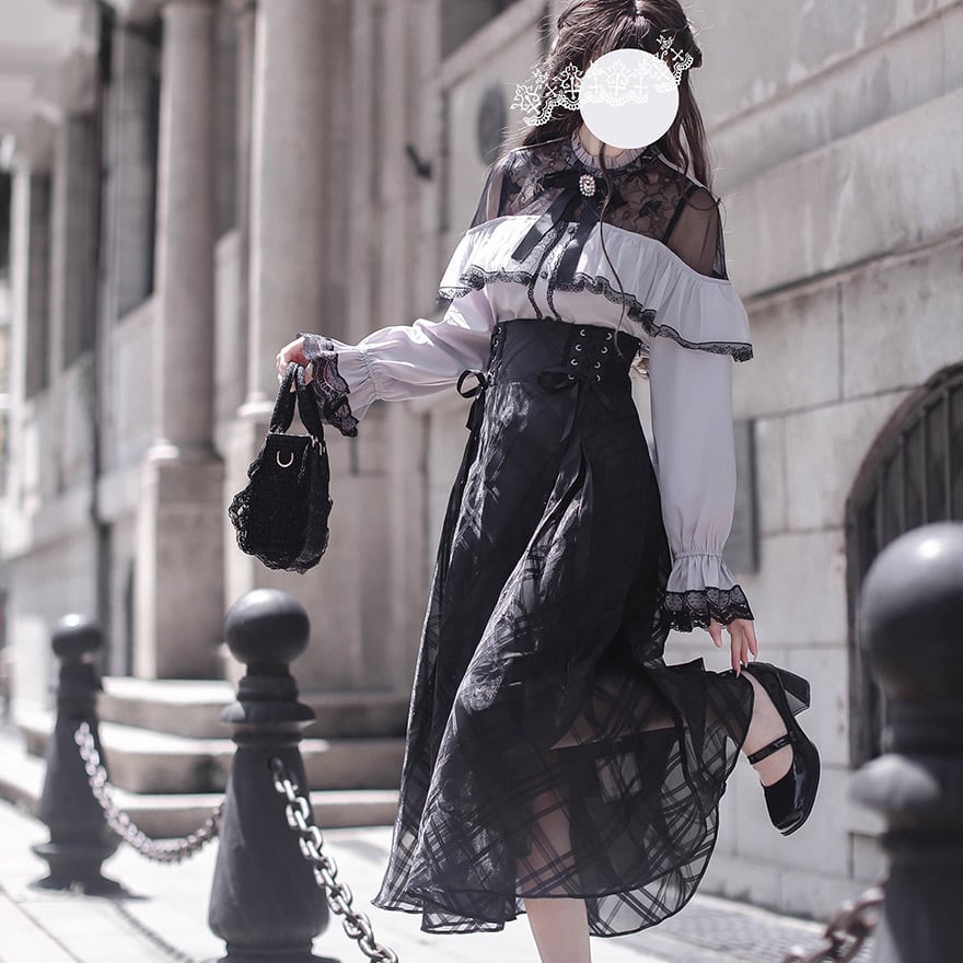 関連キーワード: #ロリータ #クラロリ #ブラウス #お嬢様 #上品 #エレガント #シースルー #レース #オープンショルダー #ボウタイ #黒 #グレー #バイカラー #可愛い