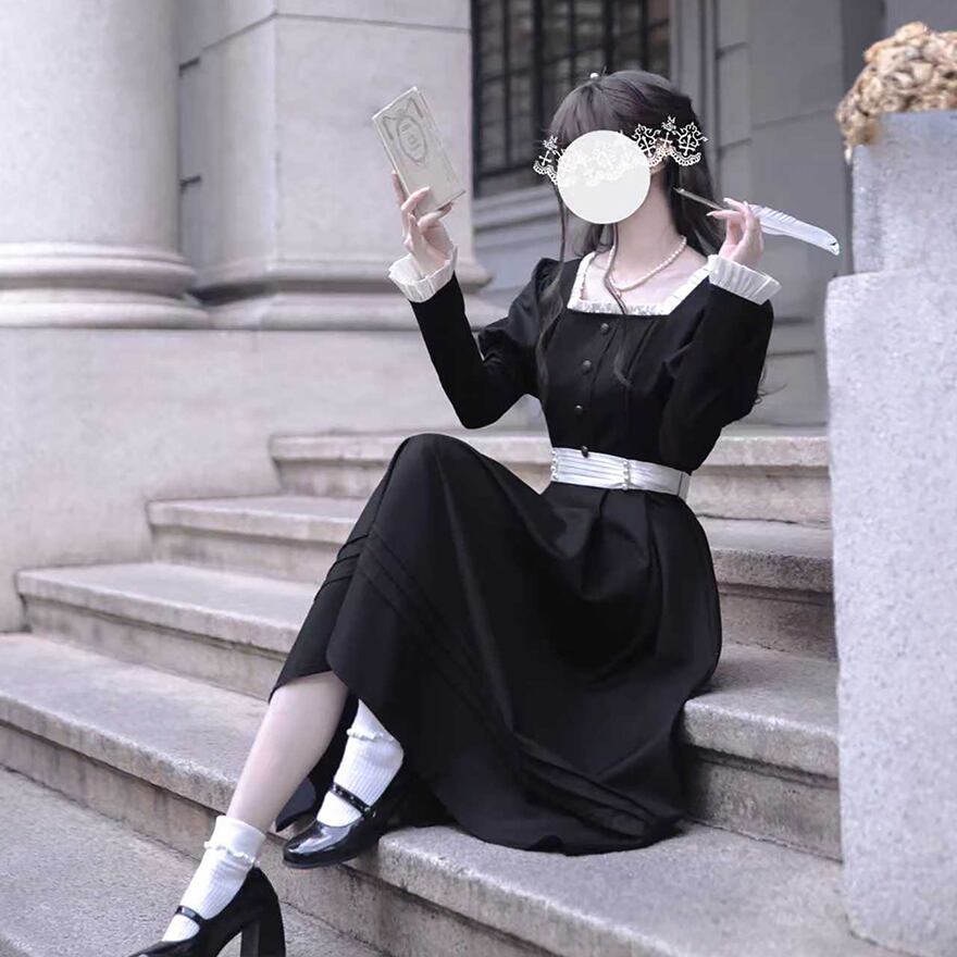 量産型 ロリィタ ワンピース 黒 クラシカル ジュリエット袖 ロング丈 白ベルト付き 胡桃木