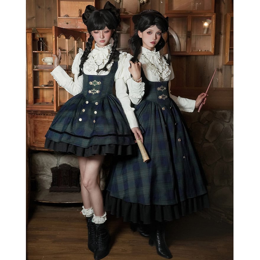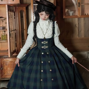 深い緑と紺のタータンチェックが知的な印象を与える、英国学院風のジャンパースカートセットです。