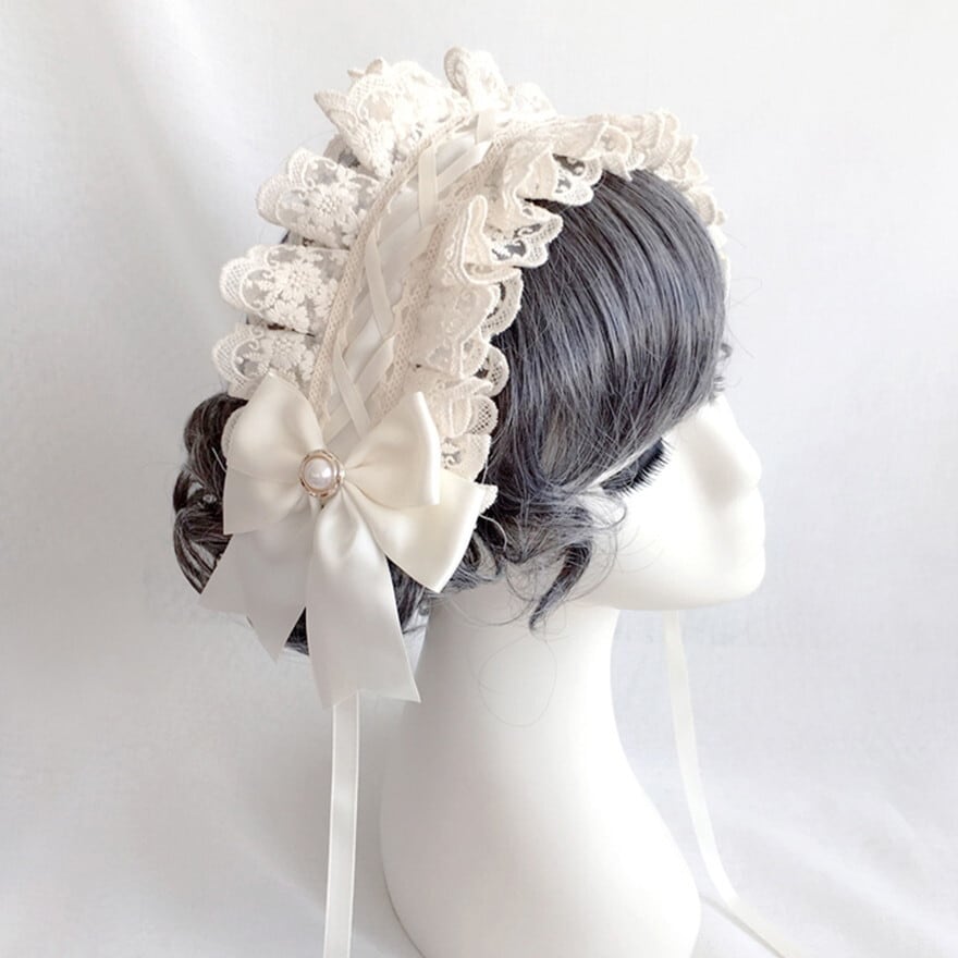 ふんわりとしたレースの質感と、上品な光沢を持つリボンが、髪を優雅に飾り立てます。