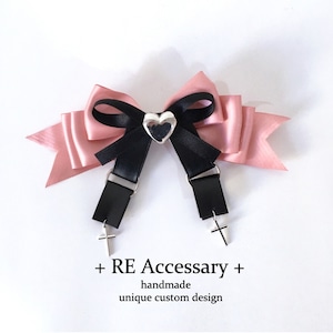 リボンの中心やアクセントには、アンティークシルバーの十字架チャームが重厚な存在感を放ち、パンキッシュな印象のチェーンや安全ピンがアシンメトリーに飾られています。