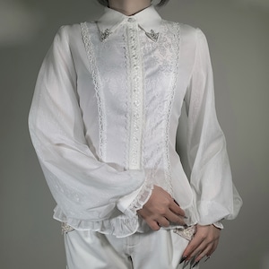 胸元を飾る幾重にも重なったフリルと、繊細なレースが目を引くゴシック系のブラウスです。