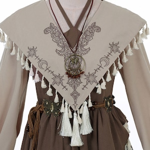 落ち着いたアースカラーを基調とし、どこか懐かしい印象を与えます。特徴的な大きなケープには、繊細な刺繍と揺れるタッセルがあしらわれ、異国情緒をプラス。