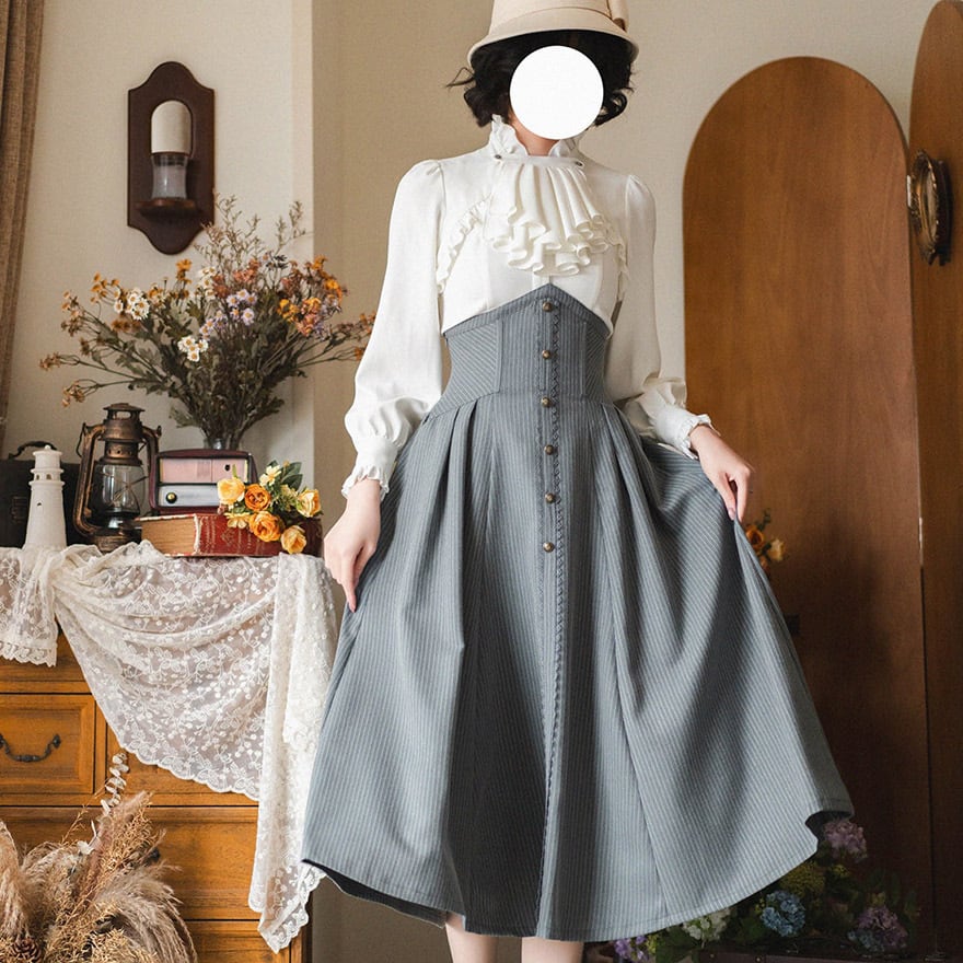 大きなリボンと、幾重にも重なったフリルのジャボ、二種類の付け替え可能なネックアクセサリーがセットになったクラシカルブラウスです。