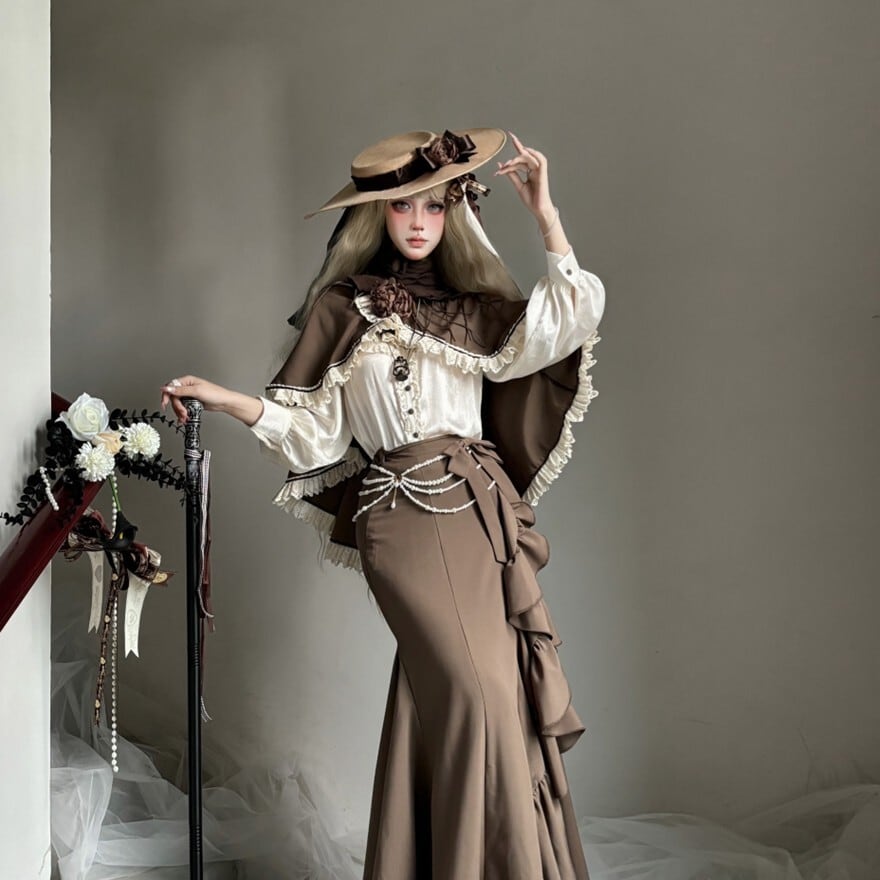 ボリュームのあるケープのシルエットと、落ち着いたブラウンの色使いが、クラシカルでミステリアスな雰囲気を演出します。