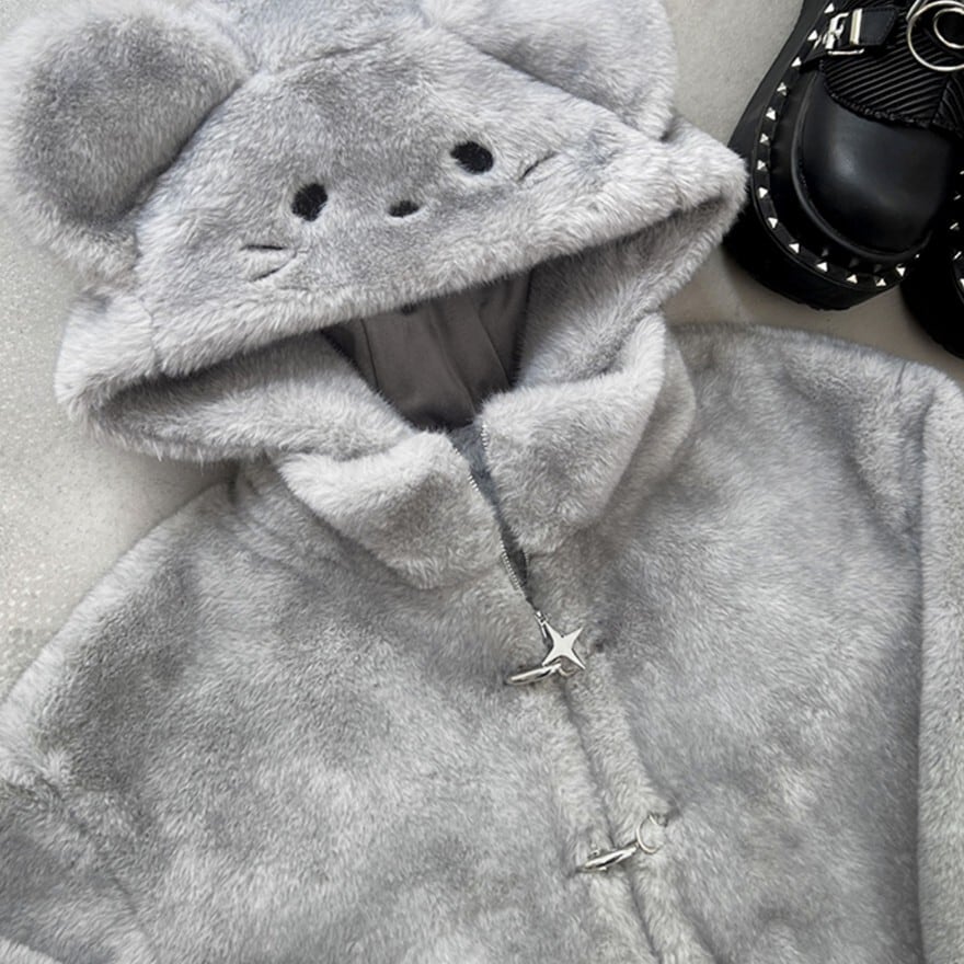 グレーのふわふわとしたファー素材を使用した、オーバーサイズのフーディジャケットです。