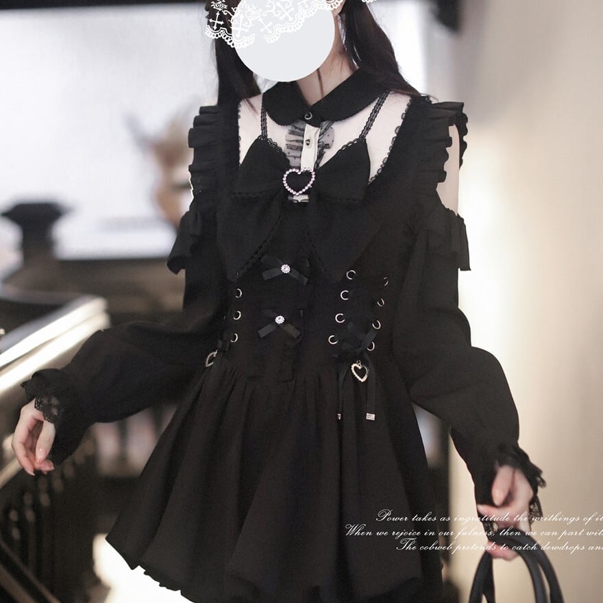 ゴスロリ系地雷 ワンピース オープンショルダー バドミントンスカート 蝶ネクタイ インナー付き