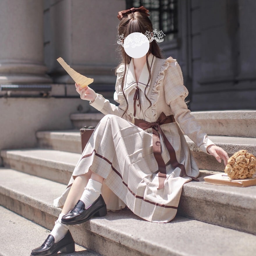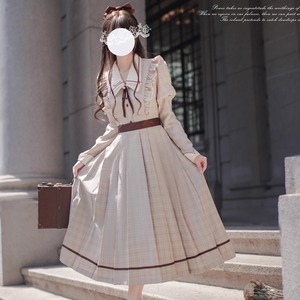 淡いベージュ系のチェック柄生地にブラウンのラインやリボン、ウエストベルトがアクセントとして施されたクラシカルなロリータワンピースです。