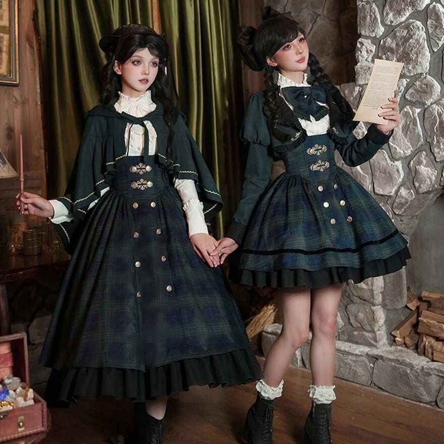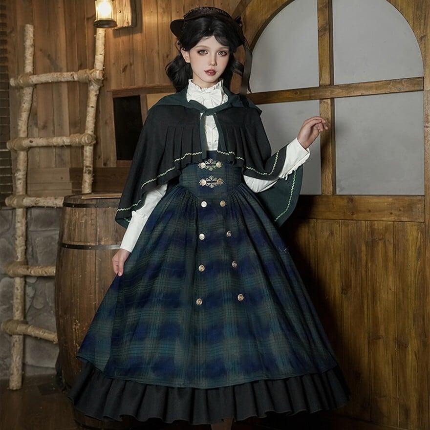 深みのあるグリーンとネイビーのチェック柄が特徴的なジャンパースカートと、フリルやパフスリーブがクラシカルな白の長袖ブラウスのセットアップです。