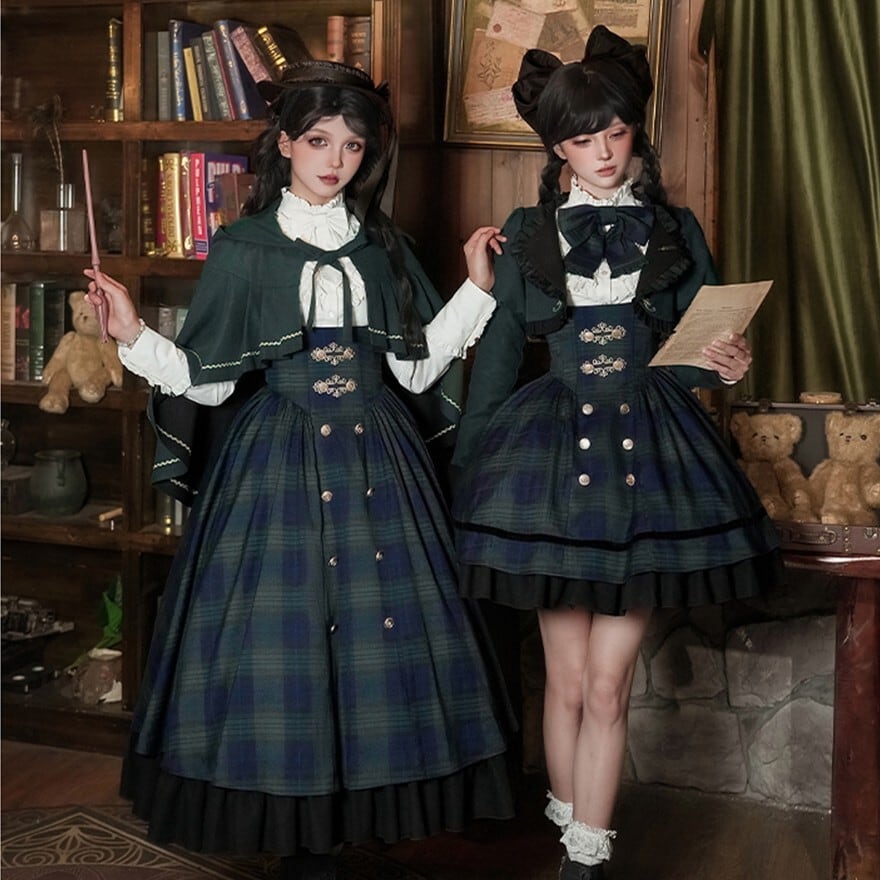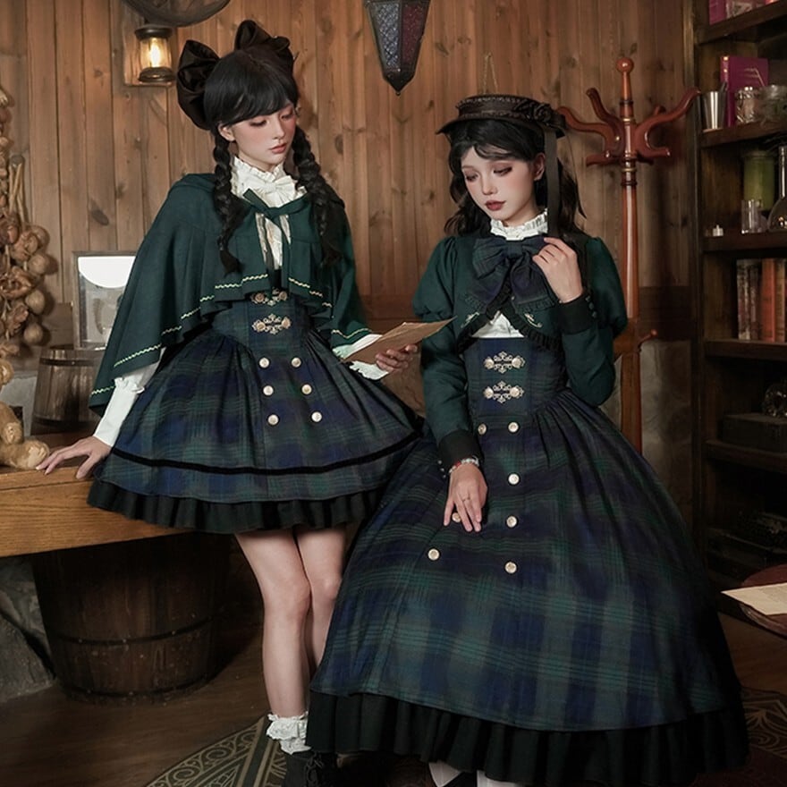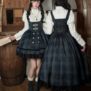 深みのあるグリーンとネイビーのチェック柄がレトロな雰囲気のショート丈ジャンパースカートと、パフスリーブとフリルが愛らしいオフホワイトの長袖ブラウスのセットアップです。