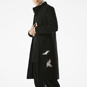 個性的なチャイナボタンに鶴の刺繍が入ったクールなロング丈チャイナ服です。