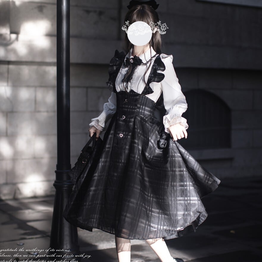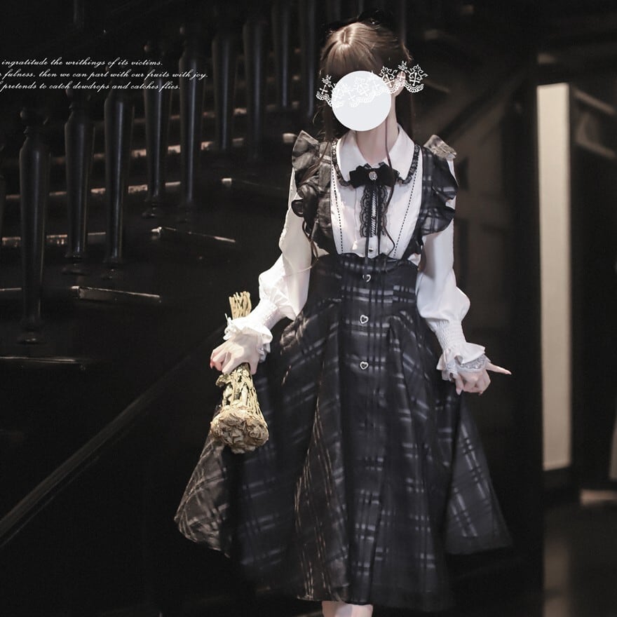 クラシカルロリィタ 控えめ 3点セットアップ チェック柄 サスペンダースカート 胡桃木